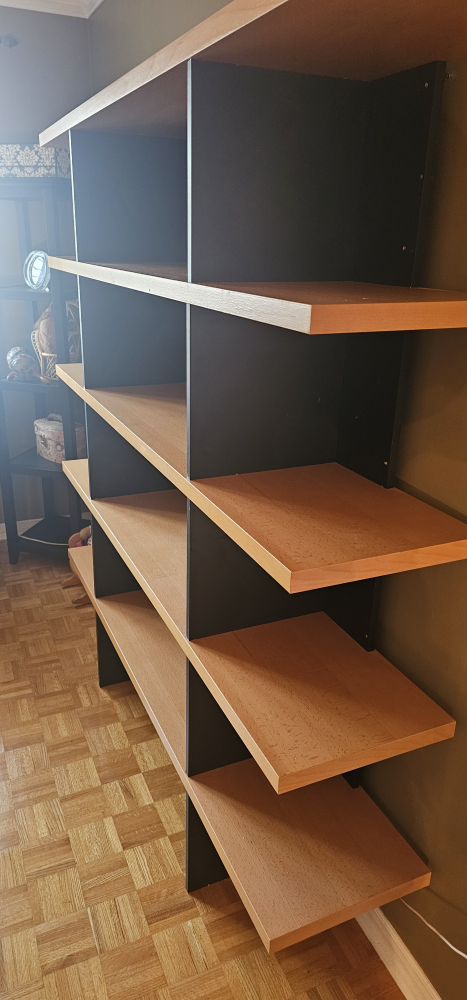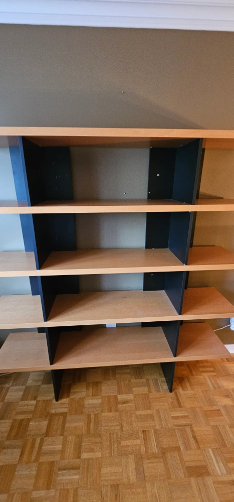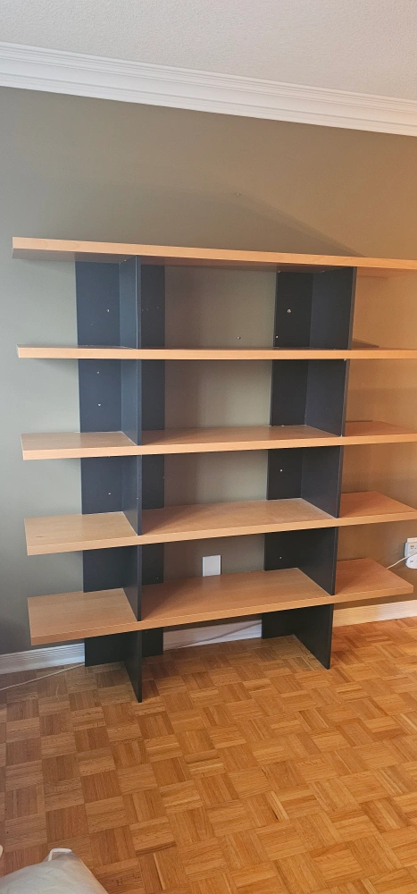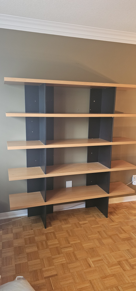 Large shelving unit Can be assembled how you like, stacked pieces . Can be assembled on the wall floating or leaned against Height is 70" Depth is 14" Width is 67" Pick up only in vaughan ! Moving no room