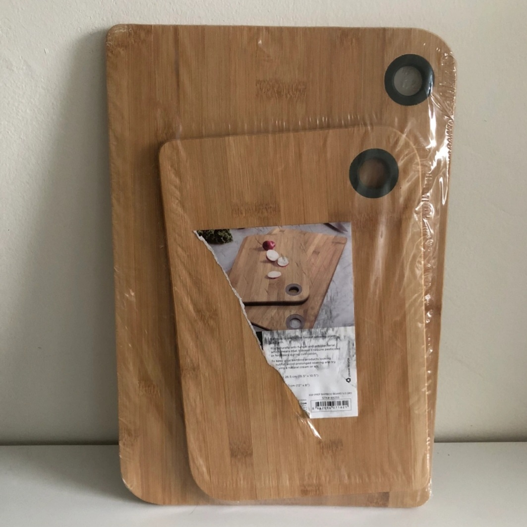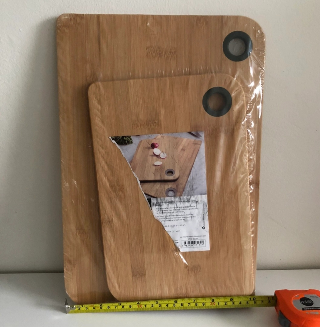 Two brand new boards, both bamboo, never taken out of package. Comes from a smoke & pet free home. Smaller board: 19 cm x 30 cm Larger board: 26 cm x 40 cm
