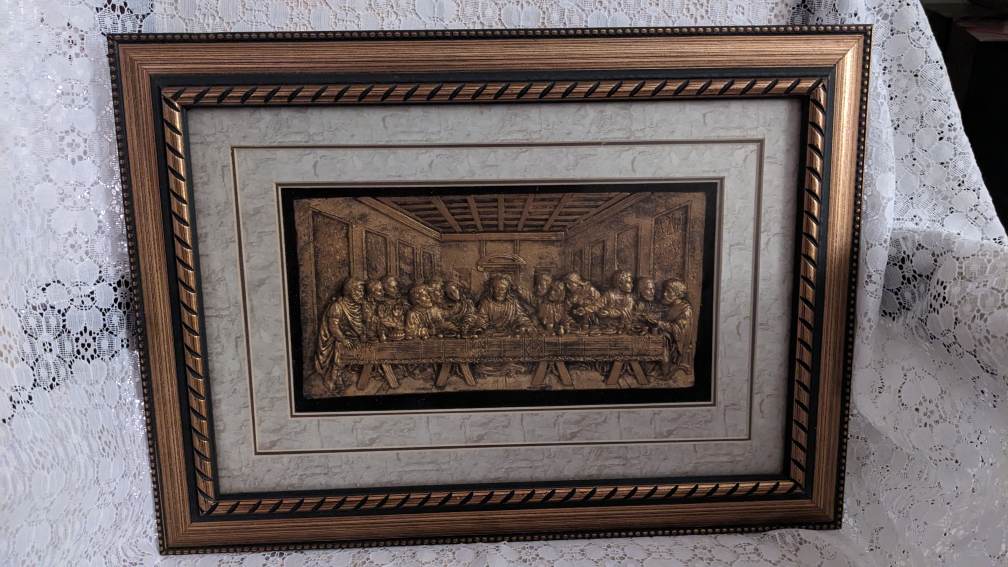 Gorgeous wall hanging in rich gold bronze with 3 dimension depiction of The Last Supper. Looks better in real life. This has never been used, it was purchased for gift giving that never happened. Would love to find a home for this beautiful piece. 12.5" x 17" Quantity Available: 2