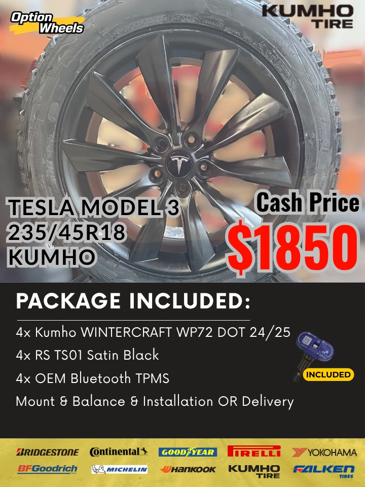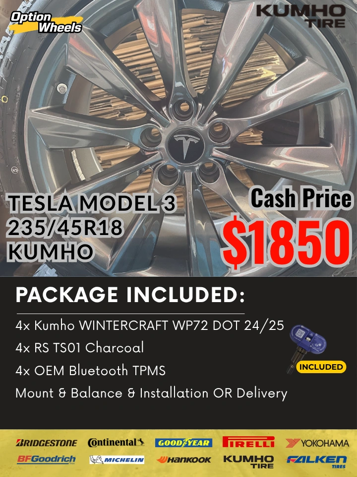 Upgrade your Model 3 with a complete winter-ready package designed for safety, style, and performance. ๐ฐ Cash Price: $1850 โ๏ธ 4x 235/45R18 Kumho Wintercraft WP72 โ๏ธ 4x RS TS01 Satin Black / Charcoal โ๏ธ 4x OEM Bluetooth TPMS โ๏ธ Mount & Balance โ๏ธ Installation OR Delivery ๐ Option Wheels โ Oakville, ON ๐ฒ Message us today to confirm fitment and lock in your winter package!