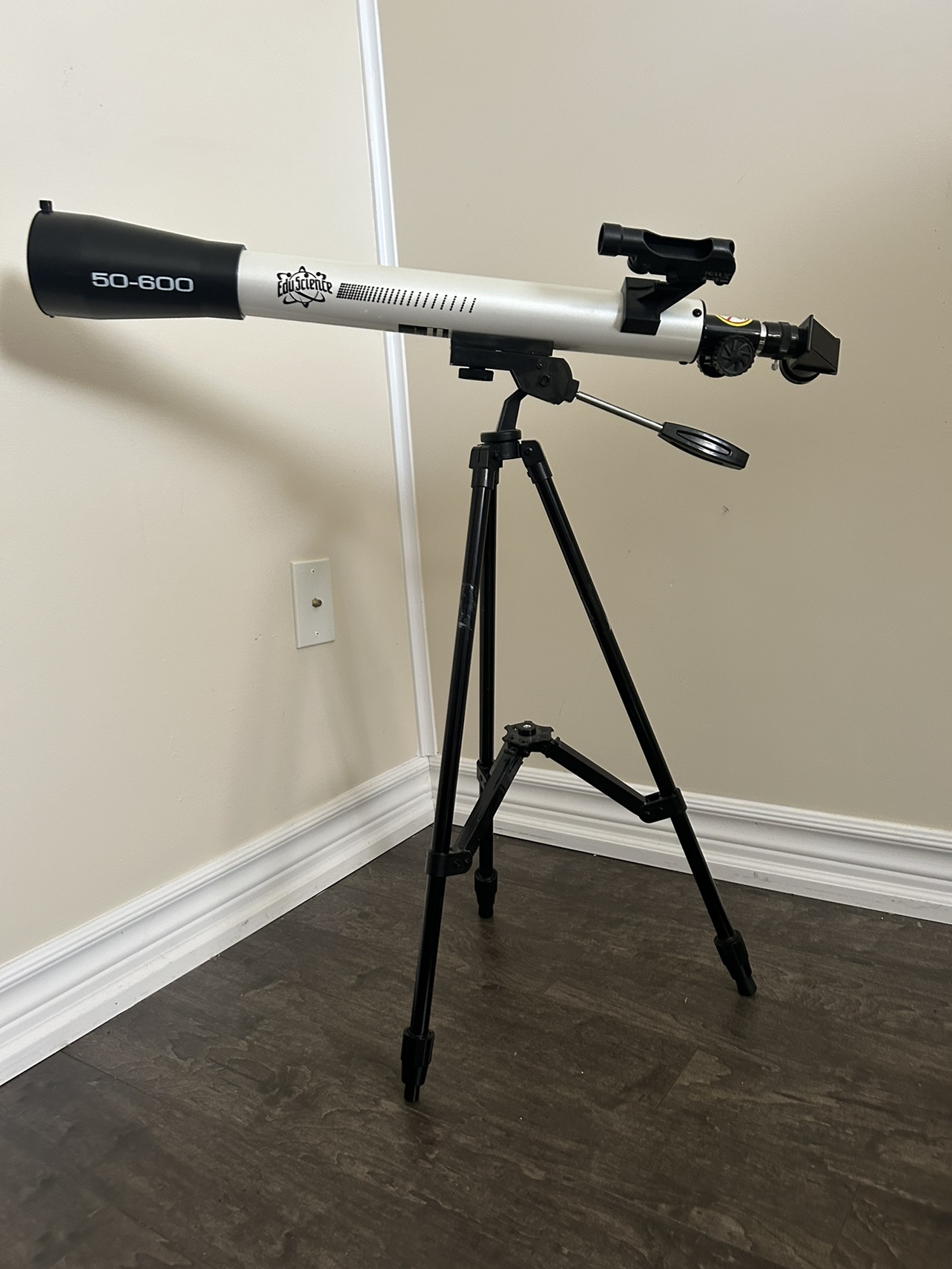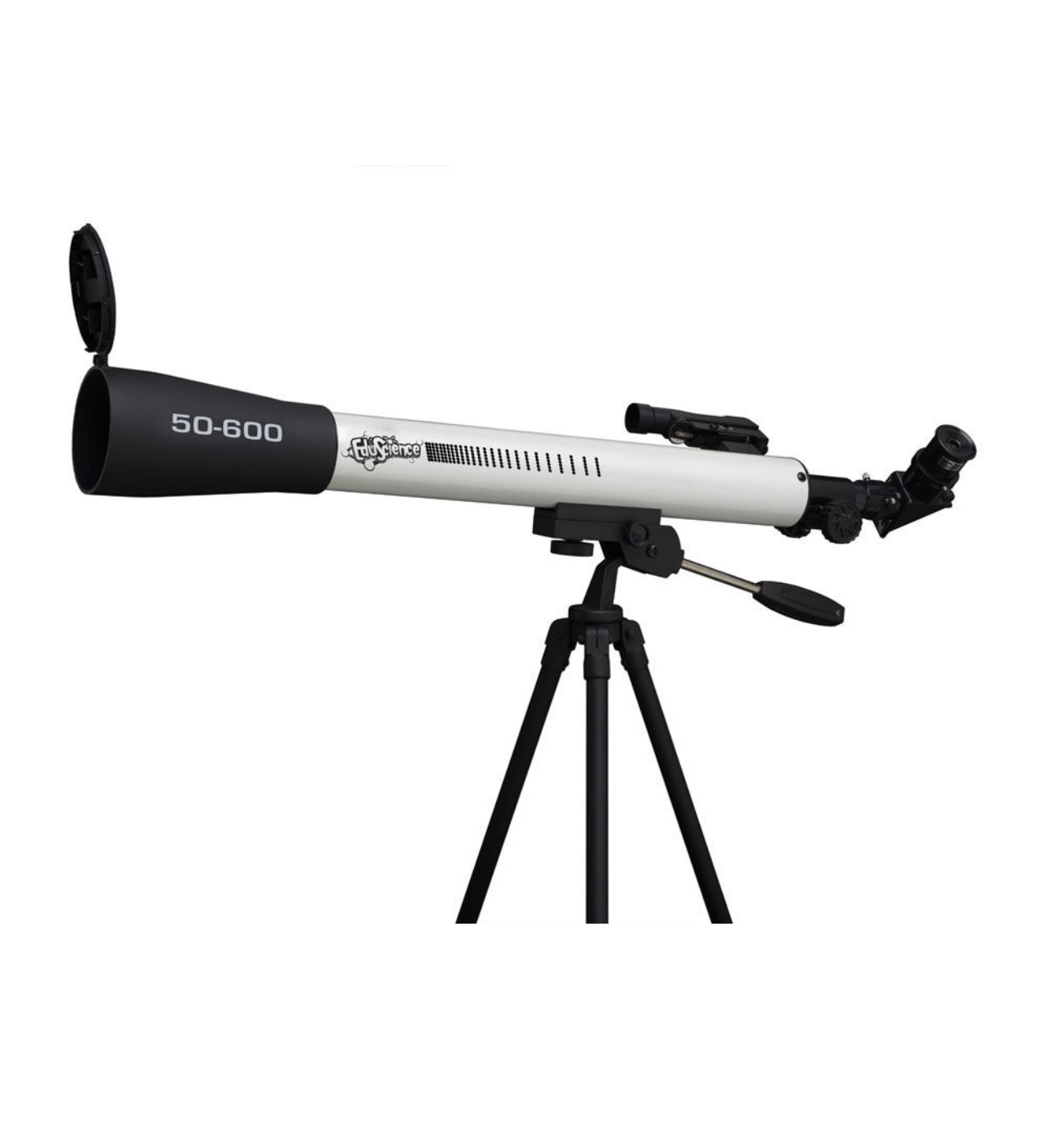 Toys"R"Us Canada Exclusive - Edu Science - Astro Precision 600 Telescope. With the 50mm aperture, you can explore the Moon's cratered surface and see intriguing planet features like Jupiter's Galilean moons or Saturn's rings. Two interchangeable Plössl eyepieces give you magnifications of 23x and 62x. Panhandle mount control allows you to smoothly move the telescope up, down and side to side. Full size tripod is fully adjustable and includes an accessory tray for holding extra eyepiece. Use the red dot viewfinder and downloadable astronomy software to locate observing targets. 50/600 Refractor telescope, 600mm focal length. Alt-azimuth with pan-tilt locking handle, aluminum fully adjustable full length tripod, H20mm & H12.5mm (1,25") eyepieces, 48x, Glass optics. https://www.toysrus.ca/en/50-600-Telescope-Refractor---R-Exclusive/E33D4A0A.html