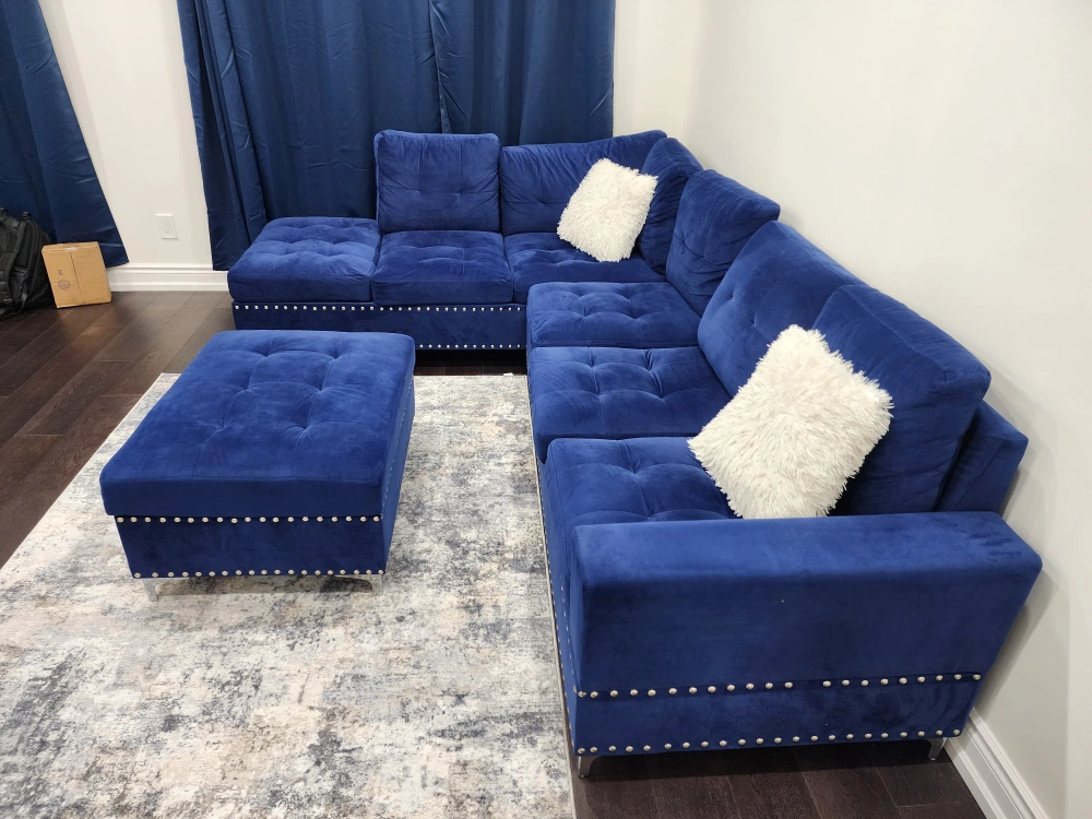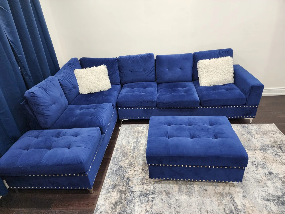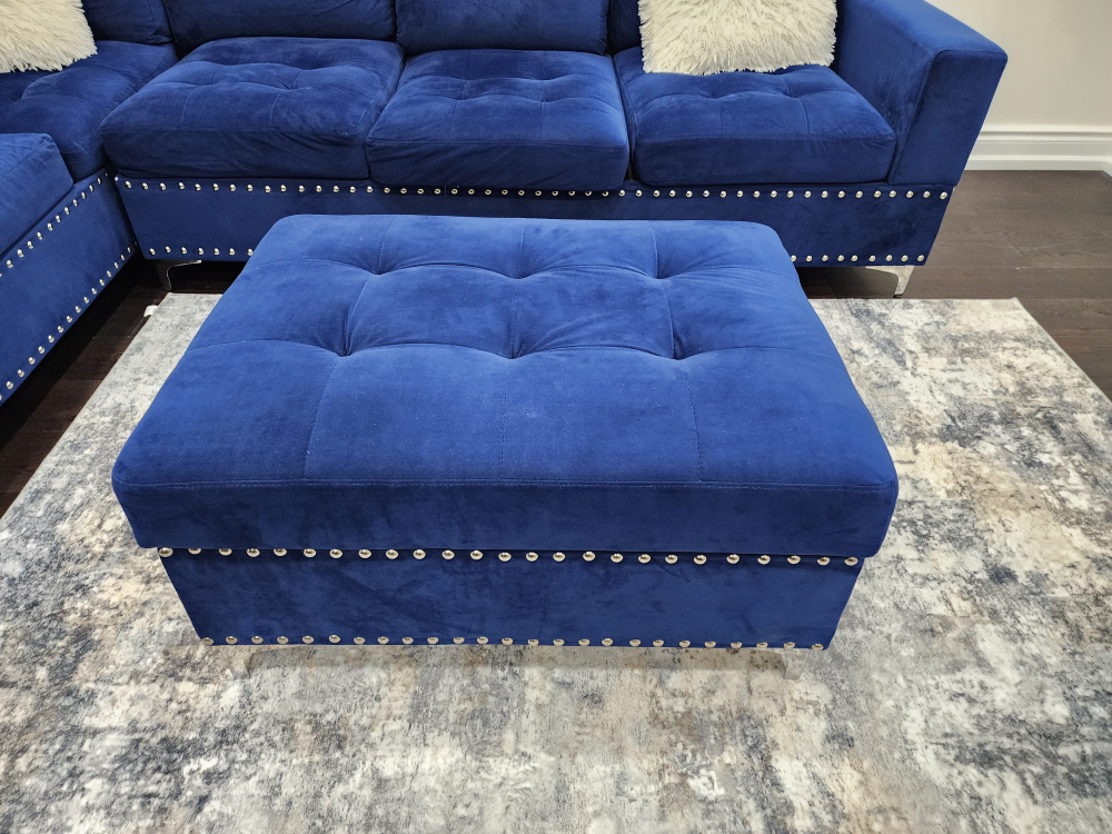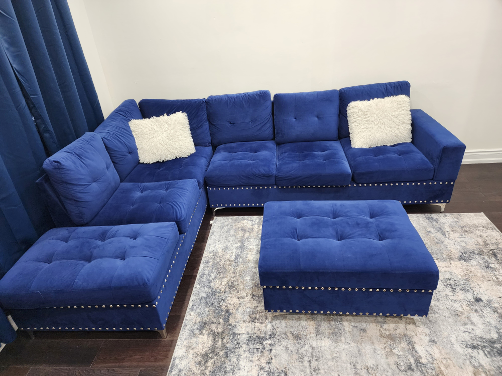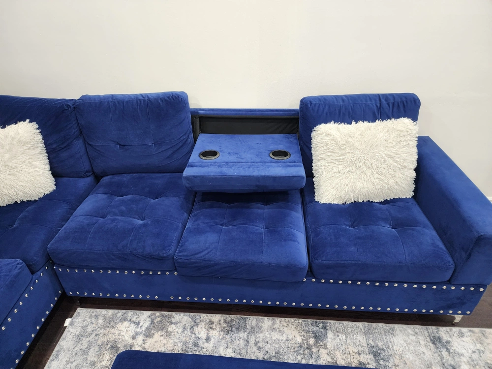 Beautiful Navy Blue Velvet L-Shaped Sectional Sofa with Storage Ottoman & Cup-holders in very good Condition.