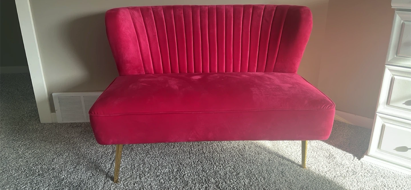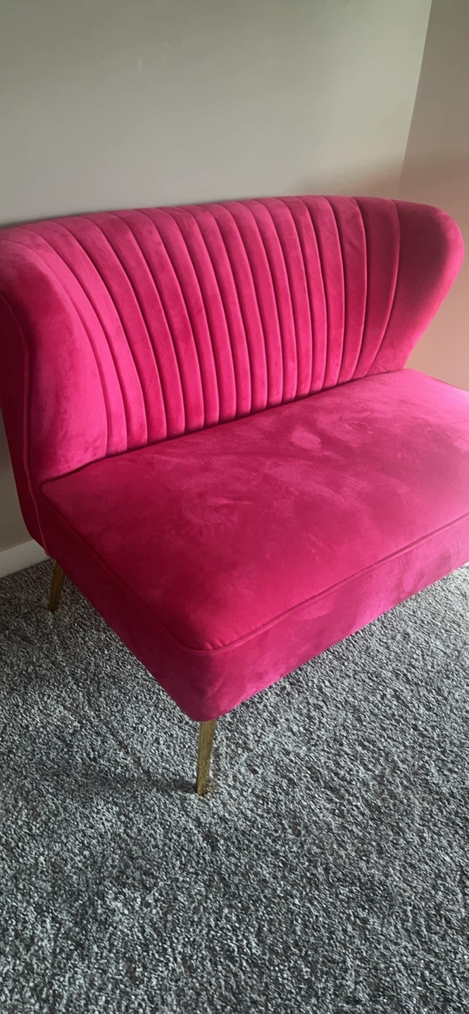 Selling a cute pink velvet loveseat! It's in great condition and would be a lovely addition to any room. The colour is a vibrant pink, and the velvet material gives it a luxurious feel. Perfect for a small space or as an accent piece!
