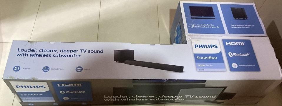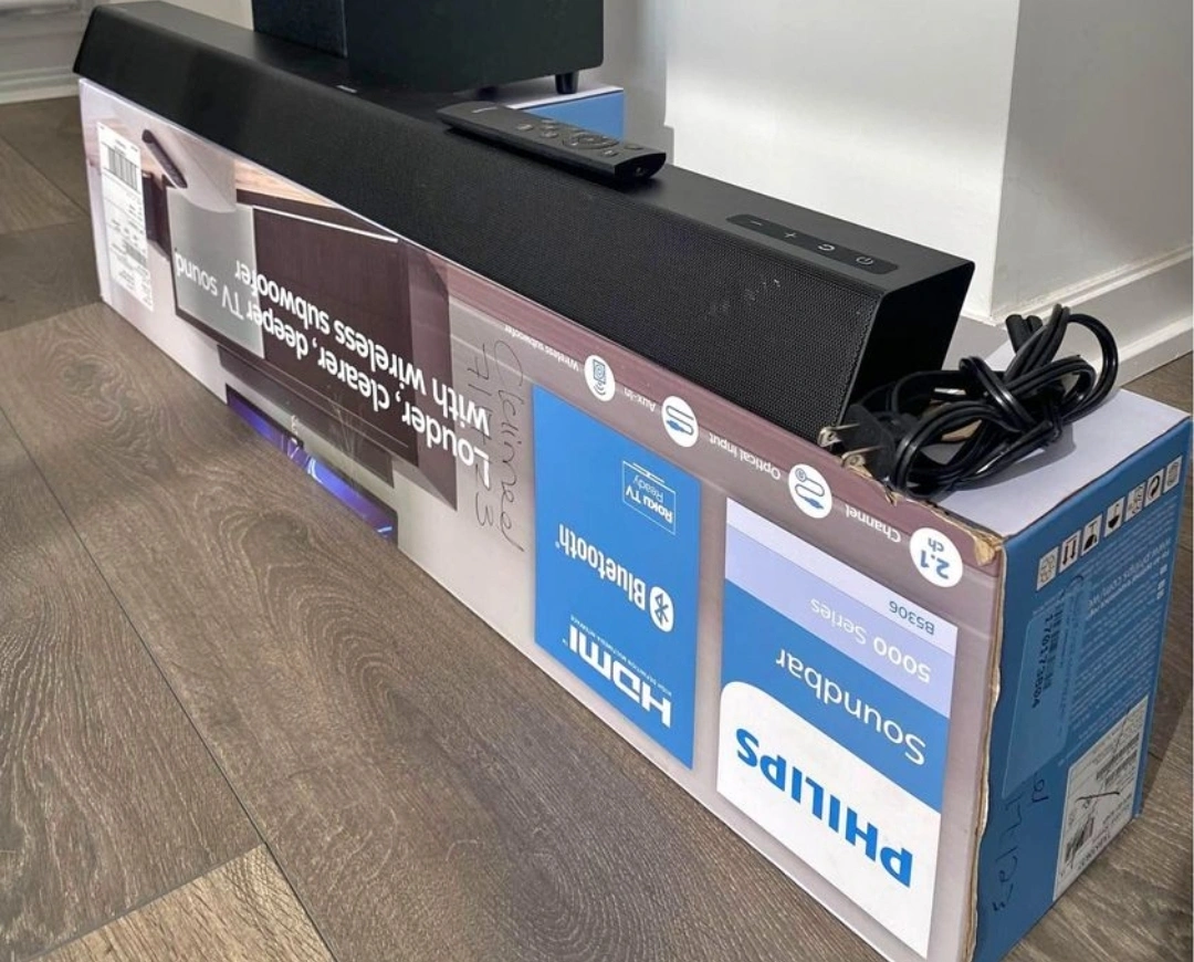 #Open box #Brand New Bluetooth only Welcome to better TV sound: Thundering explosions. Crystal clear dialogue. Philips TAB5306, a powerful soundbar with wireless subwoofer with total output of 140W, delivers exceptional performance while making it easy to control the volume using your TV remote. With 2.1 channels, every movie you watch and every soundtrack you love will sound clearer, deeper, closer. The ultra-modern trapezoid shape is designed to fit into any home setting. You can mount it on a wall with the included wall brackets, or slide it discreetly under the TV. The setup is also extremely simple, with HDMI ARC, audio-in and optical inputs. The Roku TV Ready badge means that this soundbar will work seamlessly with Roku TV, with easy access to sound settings and compatibility with your Roku remote. Simple setup. One remote. Quick settings You'll enjoy simple setup, easy access to sound settings, and compatibility with any Roku TV remote. 2.1 channels. Wireless subwoofer for deeper bass: The crackle of laser fire. The roar of a crowd. 2.1 channels bring new levels of sound to your favorite movies and shows. The compact wireless subwoofer delivers satisfying bass. Explosions will rumble. Music sounds fuller. HDMI ARC. Control the soundbar with your TV remote: The days of hunting for multiple remotes are over. This soundbar connects to your TV via HDMI ARC, allowing you to control soundbar volume with the same remote you use for your TV. Connect your favorite sources for bigger sound: Stream playlists from your mobile device via Bluetooth. Connect audio sources via audio-in or optical input. Whatever you love, it will sound louder and clearer through this soundbar. Distinctive geometric design. Easy placement: This soundbar boasts a unique slanted design and a low profile. When it comes to placement, the included wall brackets keep your options open. The compact design of the powerful subwoofer makes it easy to conceal.