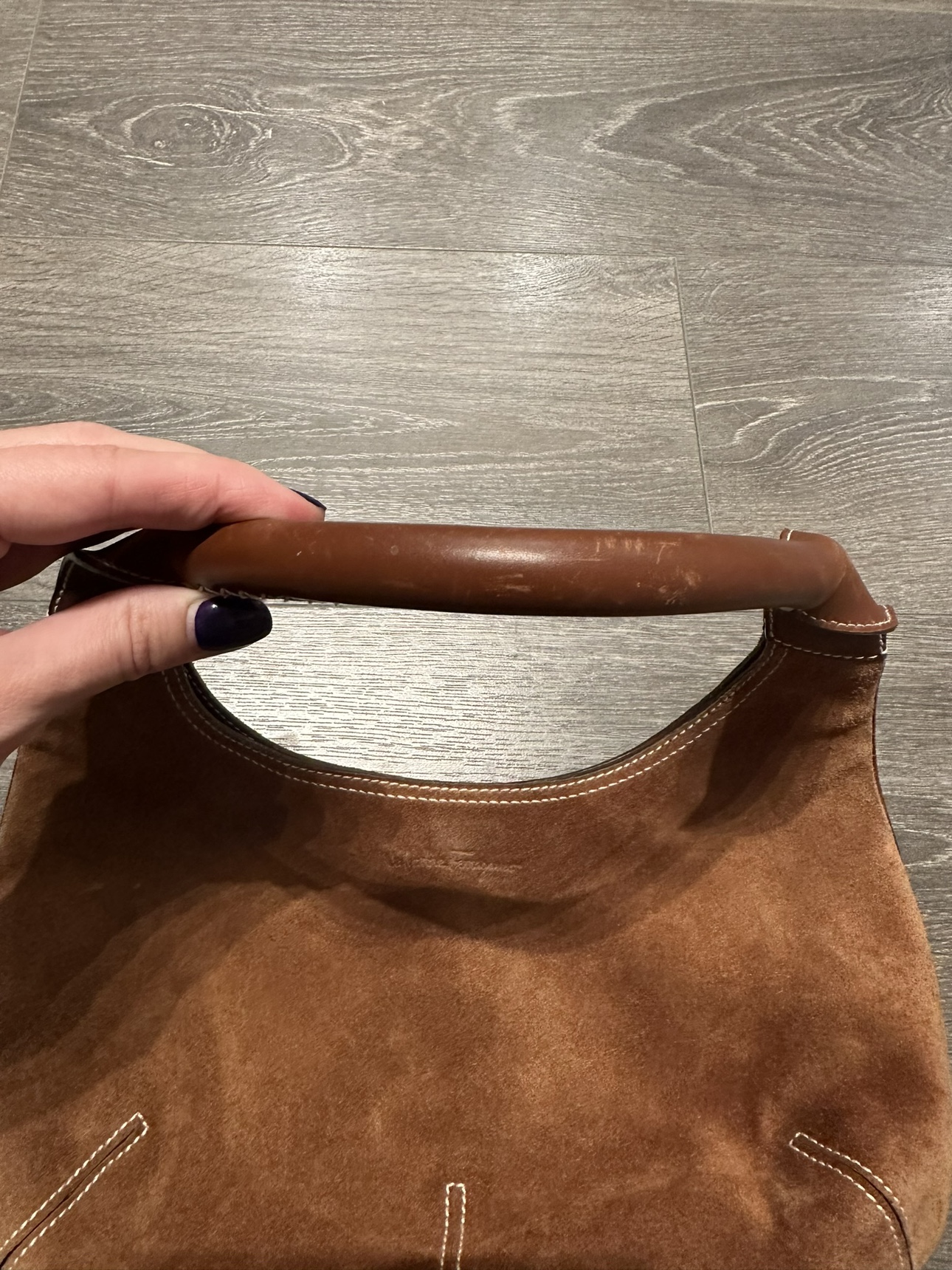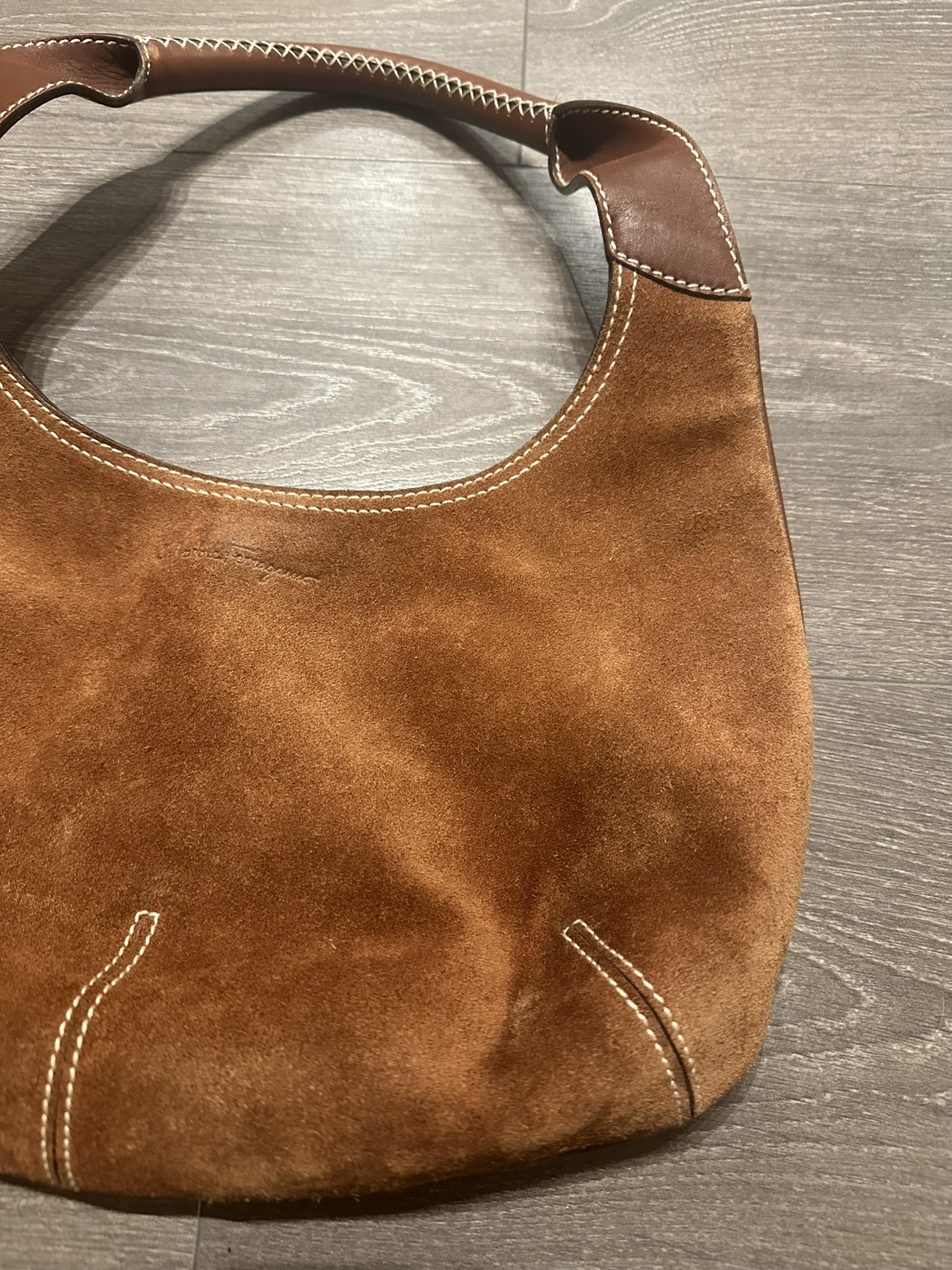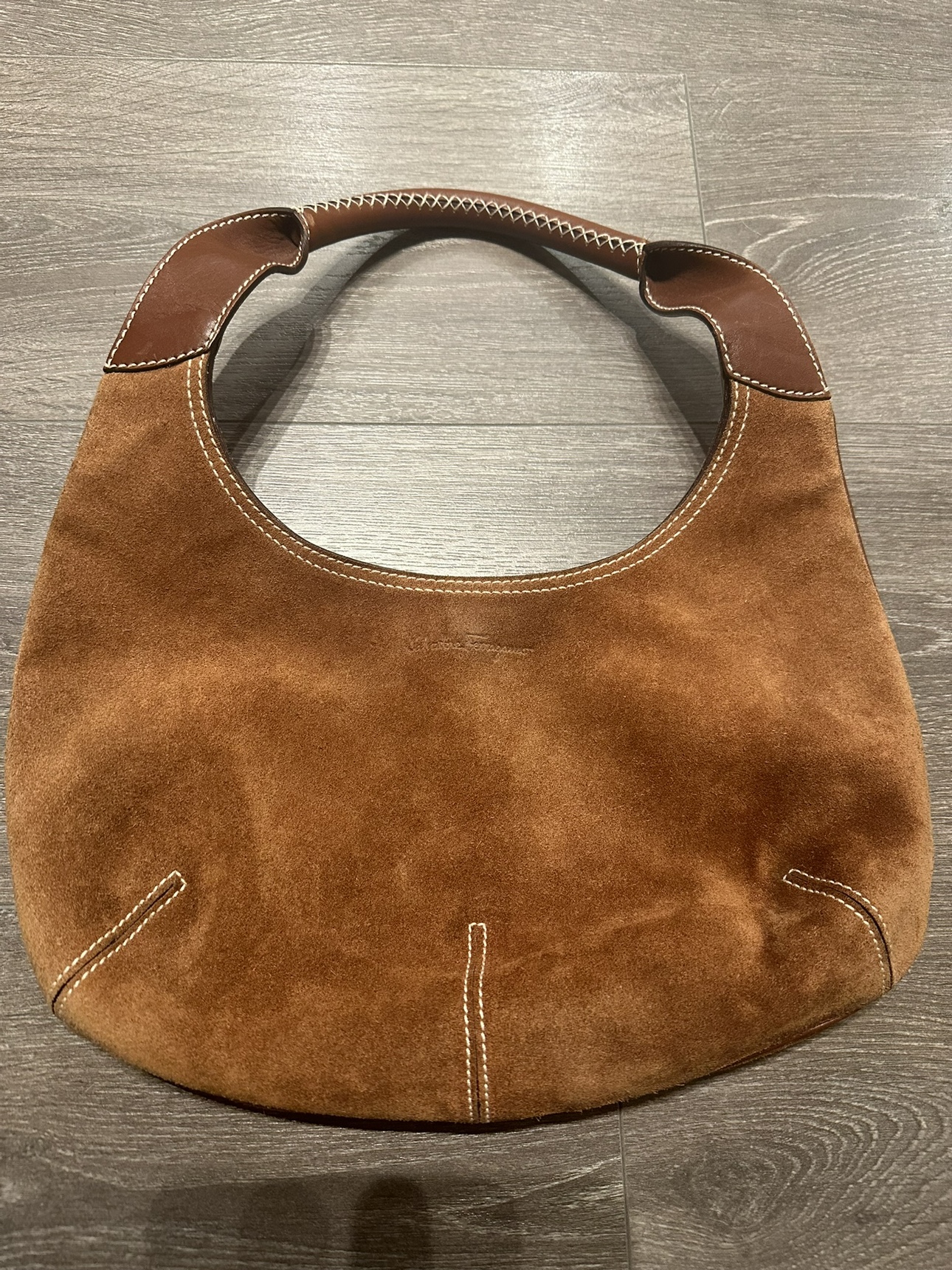 Salvatorre Ferragamo Hobo Brown Suede Leather Shoulder Bag - Made in Italy Good pre-owned condition Signs of wear shown in photos The inside lining is in great condition the bag measures approximately 7.5 inches (height) inches by 13.5 inches (length). The top of the handle to the top of the bag is 8 inches. Please check my other items. Lots of items available for sale :)