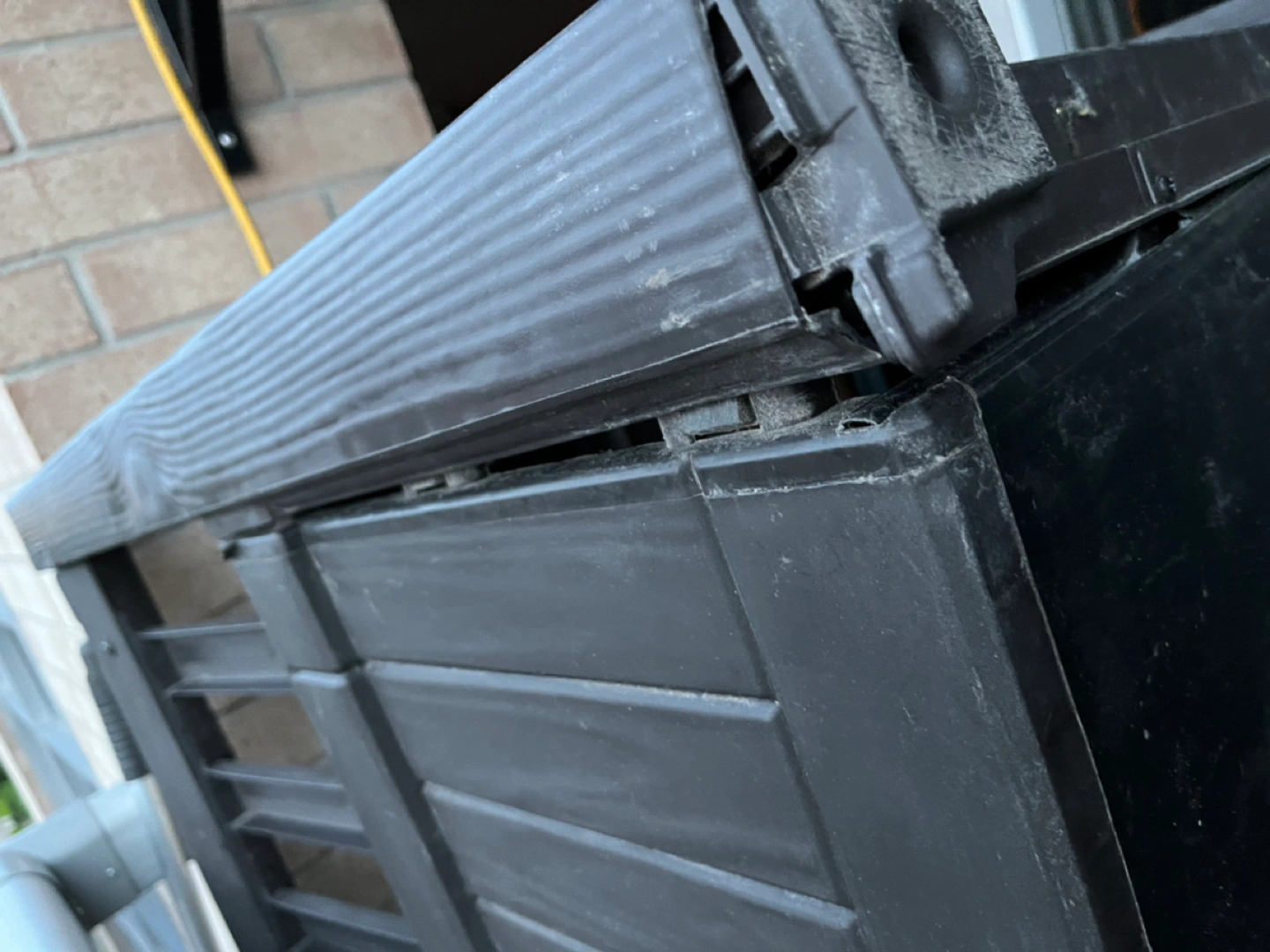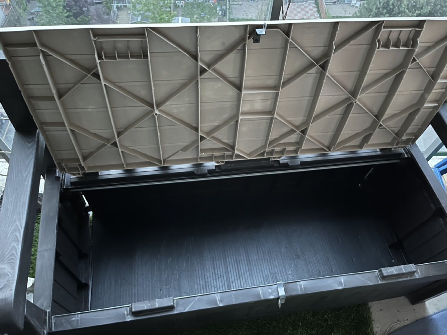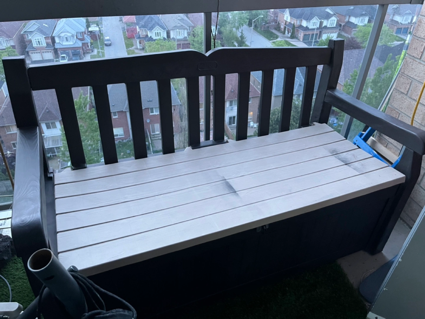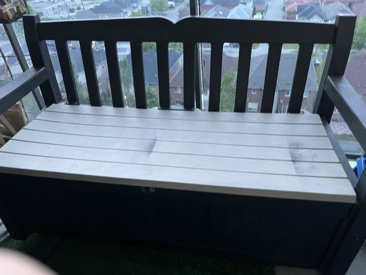 With warm weather approaching make more use of your outdoor space with this bench with storage for the backyard, patio, or balcony. It served us well in our condo balcony by giving extra room for storage and to lounge on with the morning coffee or a good book. Also provided great seating for entertaining outdoors. It has some wear but still functional (see last two photos). Originally purchased from Canadian Tire for $290.