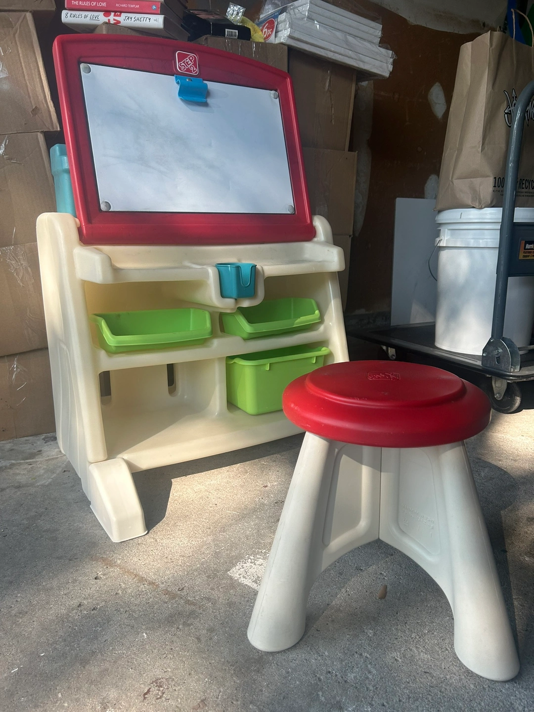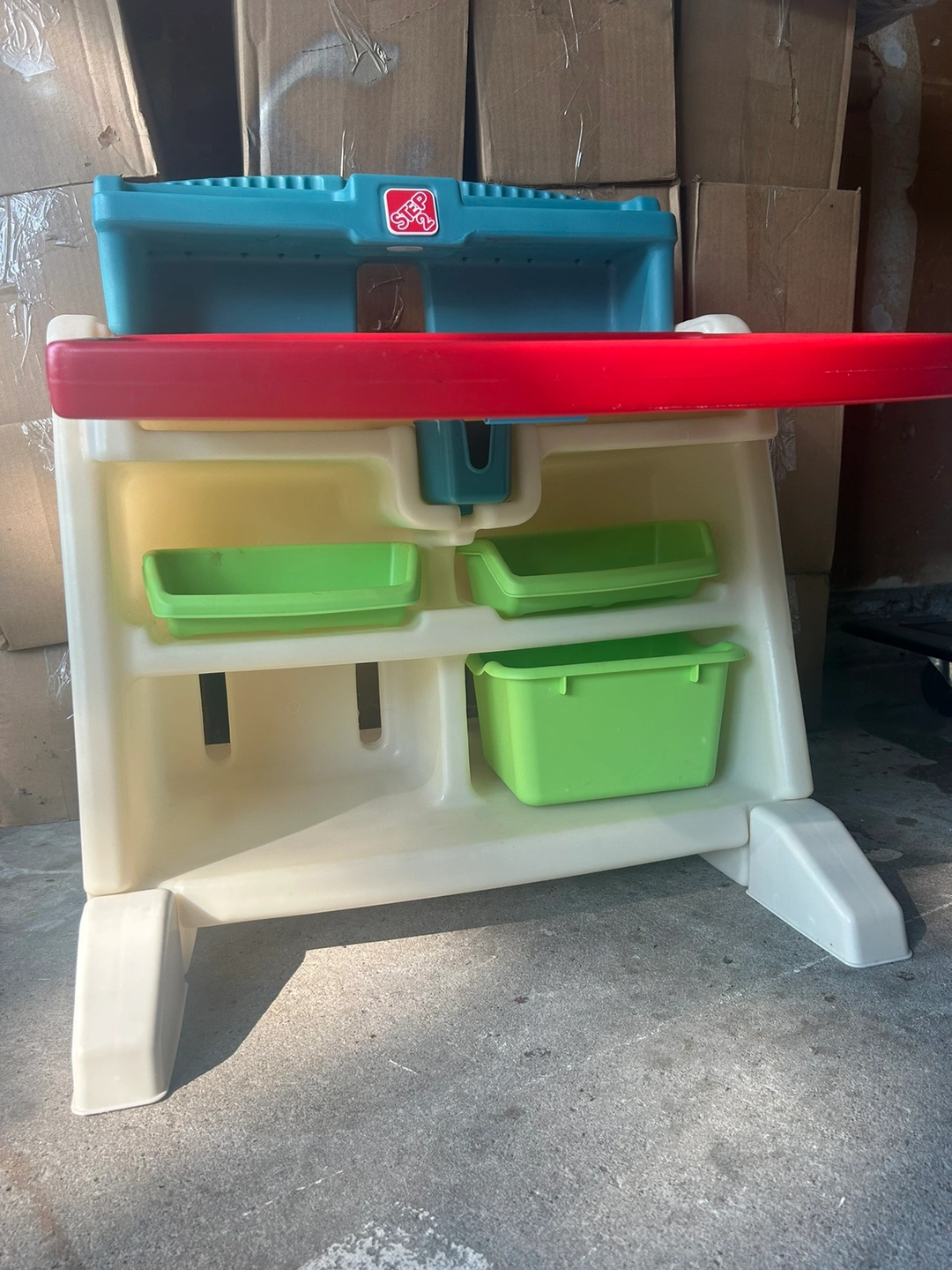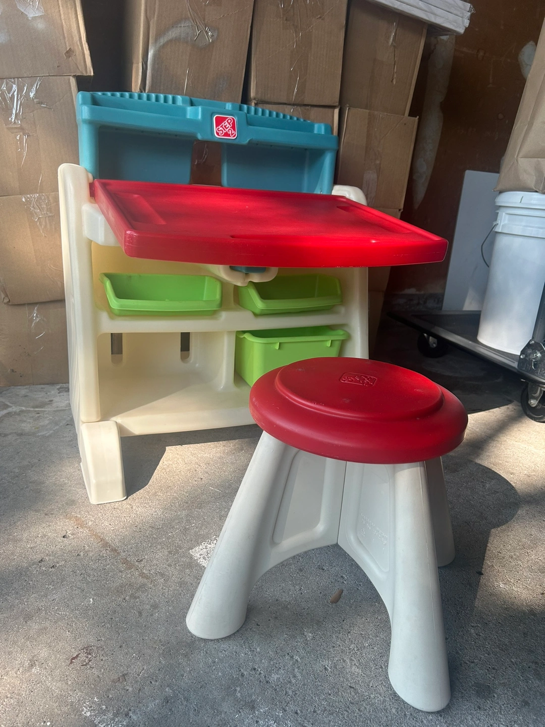 Step2 Flip And Doodle Easel Desk with Stool Includes Desk, with foldable feature and art supply holder Stool Three bins The Step2 Flip and Doodle Easel Desk with Stool is a 2-in-1 desk and easel for kids that encourages little ones to flex their artistic imaginations. The fresh design of this art play set will brighten up a child’s play room or bedroom. It features large amounts of storage for children to organize crayons, finger paints, and other art supplies. Video available on Facebook: https://www.facebook.com/share/RaUkxk7bT4ksi2ab/?mibextid=79PoIi