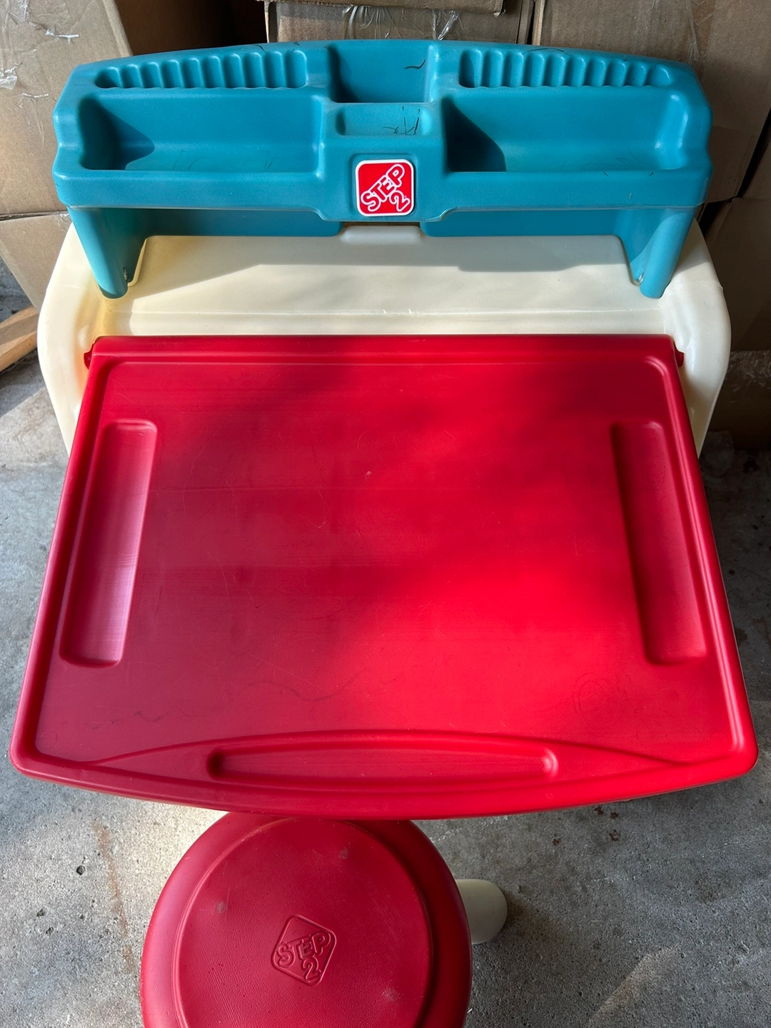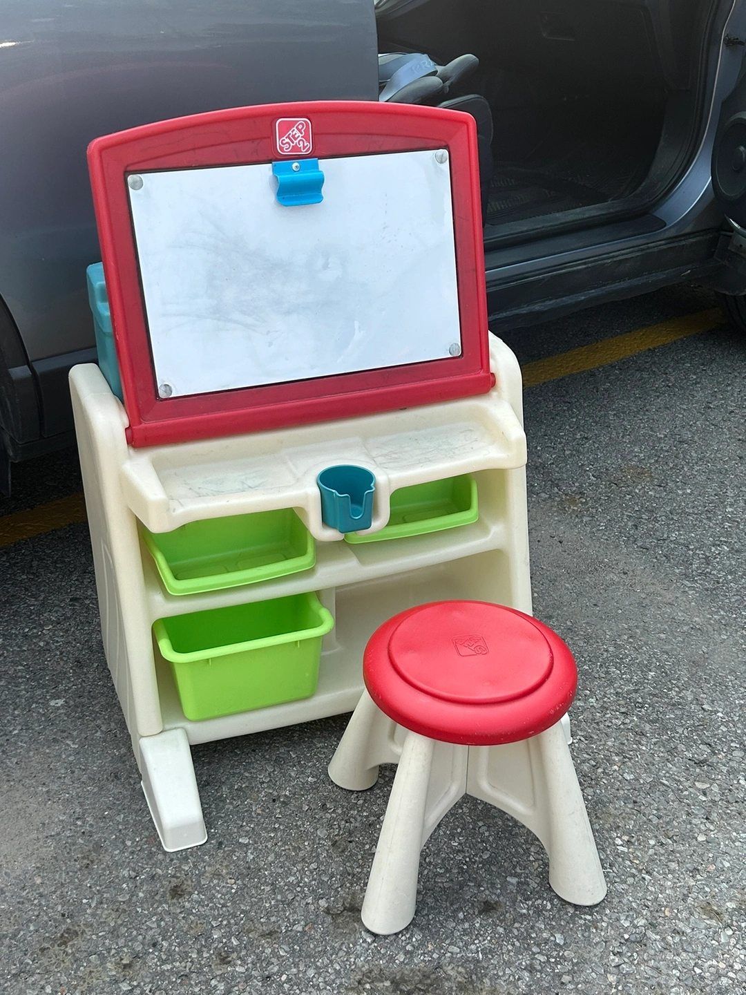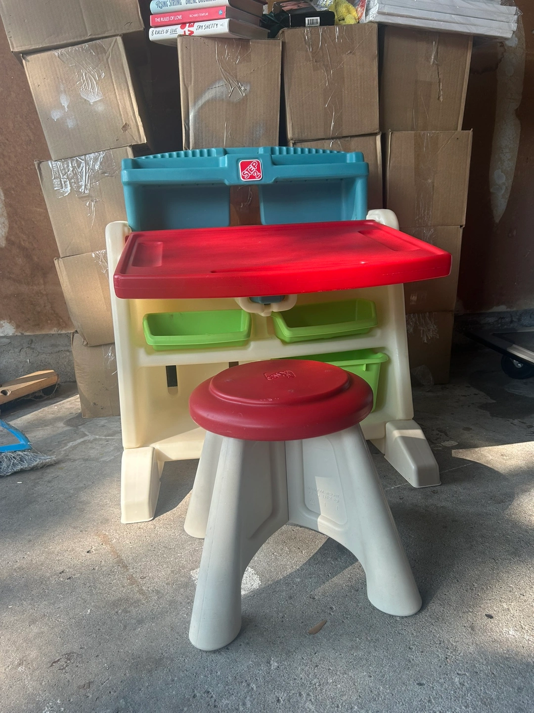 Step2 Flip And Doodle Easel Desk with Stool Includes Desk, with foldable feature and art supply holder Stool Three bins The Step2 Flip and Doodle Easel Desk with Stool is a 2-in-1 desk and easel for kids that encourages little ones to flex their artistic imaginations. The fresh design of this art play set will brighten up a child’s play room or bedroom. It features large amounts of storage for children to organize crayons, finger paints, and other art supplies. Video available on Facebook: https://www.facebook.com/share/RaUkxk7bT4ksi2ab/?mibextid=79PoIi