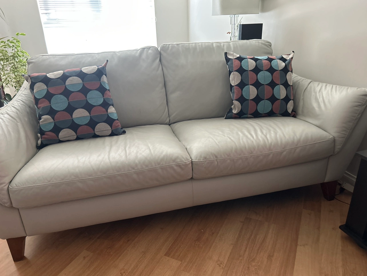 A beautiful, off-white appeal leather sofa in great condition. The brand is “Italsofa” from the Hudson Bay. It has a curved sides and wooden legs. This sofa is a great addition to any living room. Very comfortable & comes with those beautiful matching cushions. Dimensions: L. 78 inches W. 38 H. 36