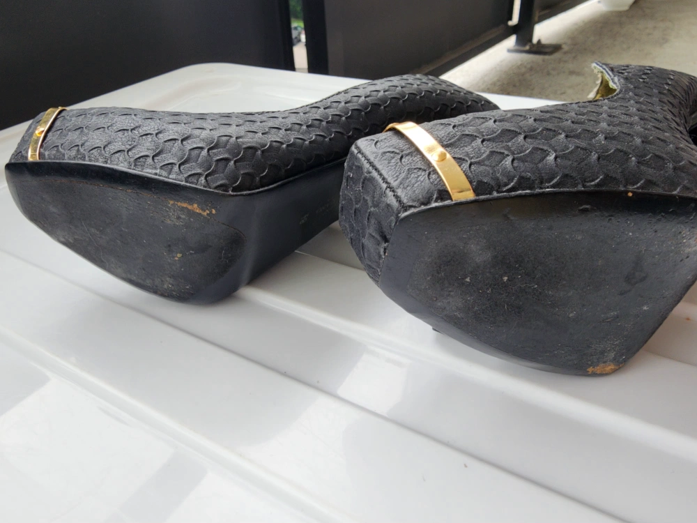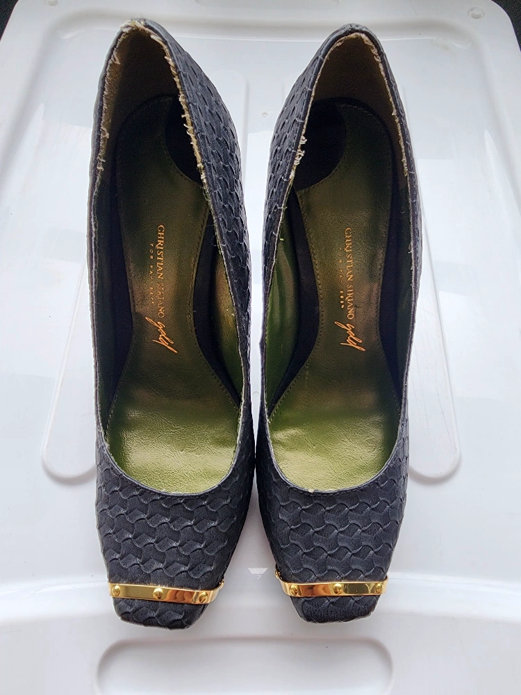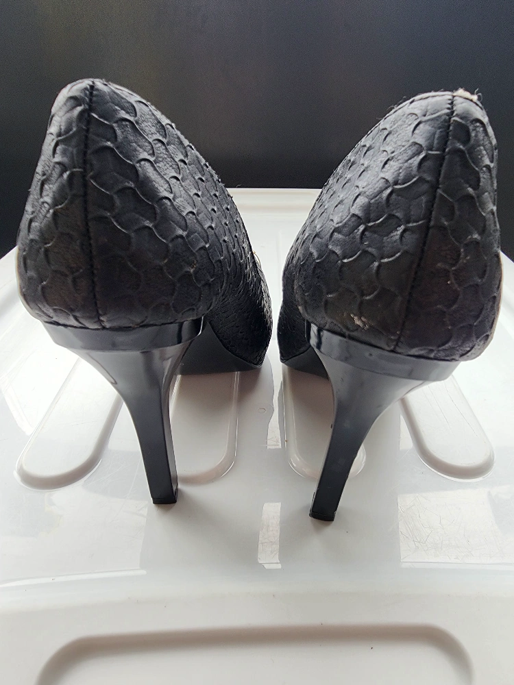 Used but good condition. Closet clearout. Black heels with gold embellishments at the toe of the shoe. Square toe. As I am still this size, apparently I am a wide foot now. These shoes have alot of life left in them. Please read and understand : Exact cash only, final sale, no deliveries. Main intersection Bathurst and Sheppard. If the ad is up then it is available!
