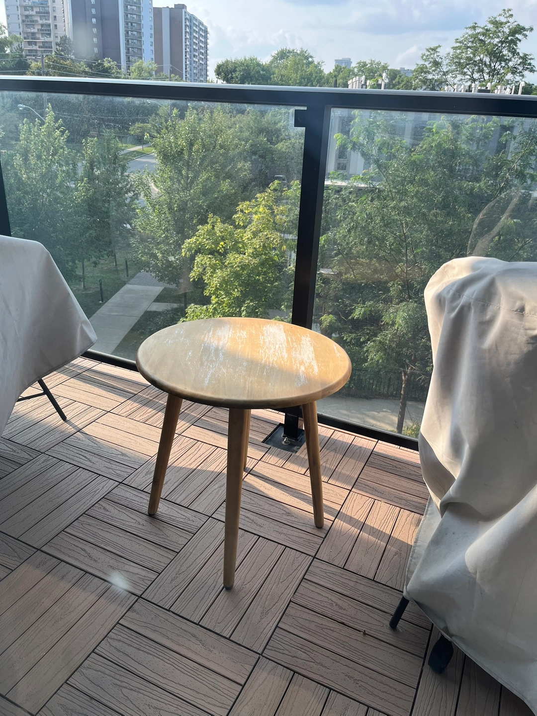 Solid Acacia frame Character and grain of the wood will vary for each piece Acacia wood will weather to a soft gray over time. Used and weathered. Will need to be cleaned