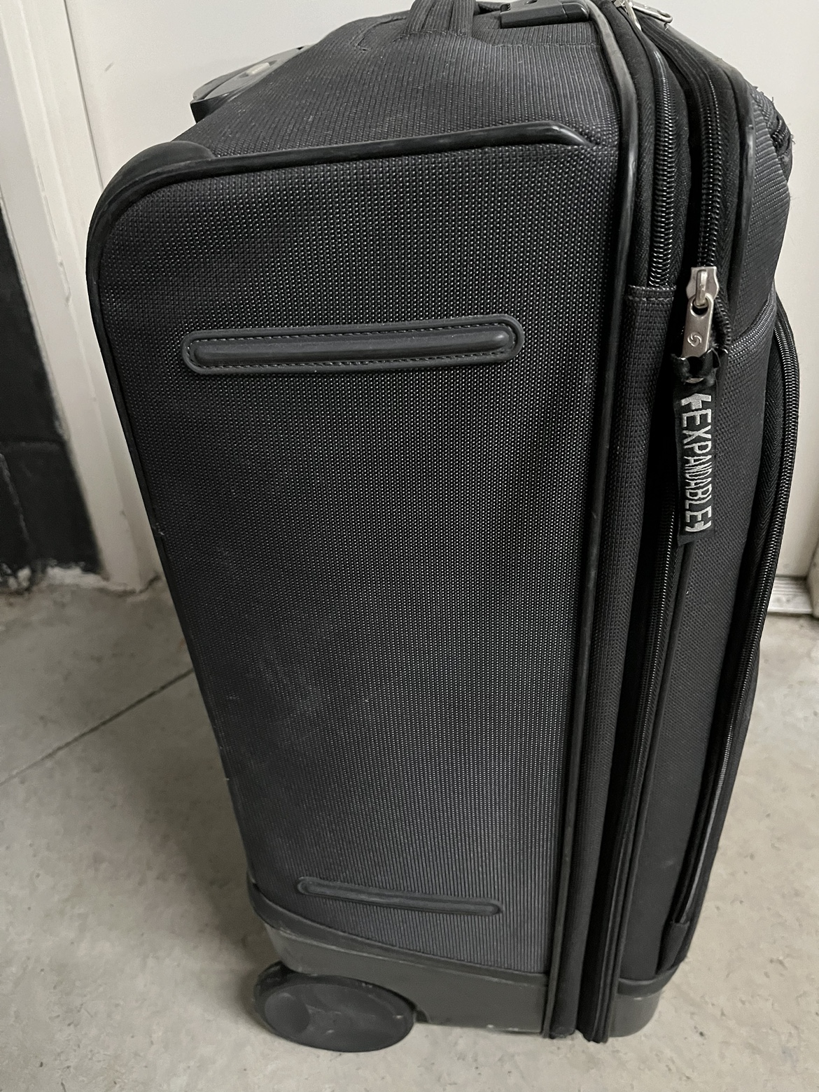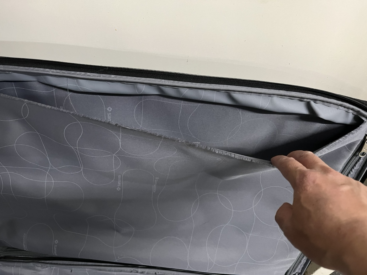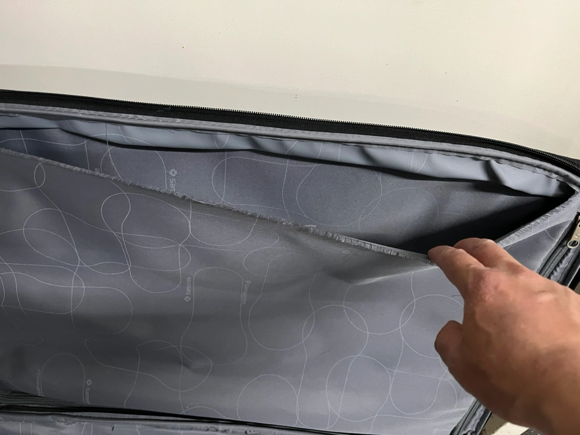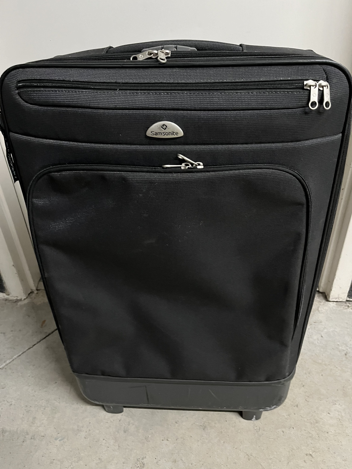 Black Samsonite suitcase with extendable handle, two wheels, and zippered exterior pockets. Interior compression straps. Wheels, handle, and zippers work well. There is a tear in the interior compartment, but it doesn’t expose the outside. See the last picture to see the tear. I don’t remember the 3 combo lock but you don’t need it to close and open the suitcase. Dimensions: 17.5 x 10 x 27 inches.