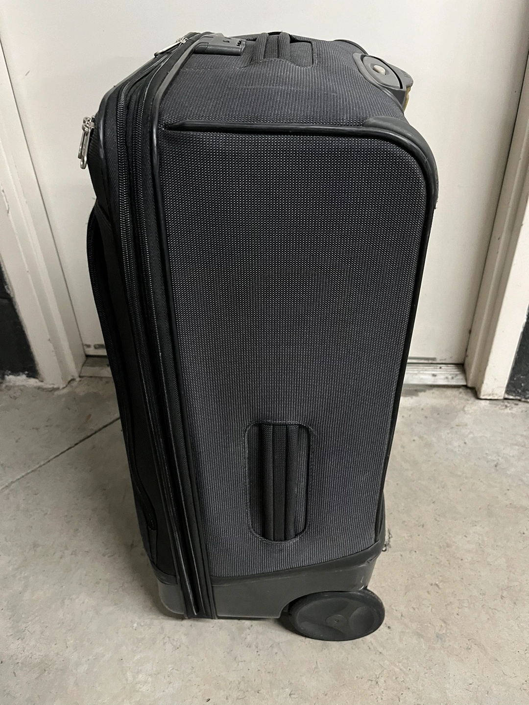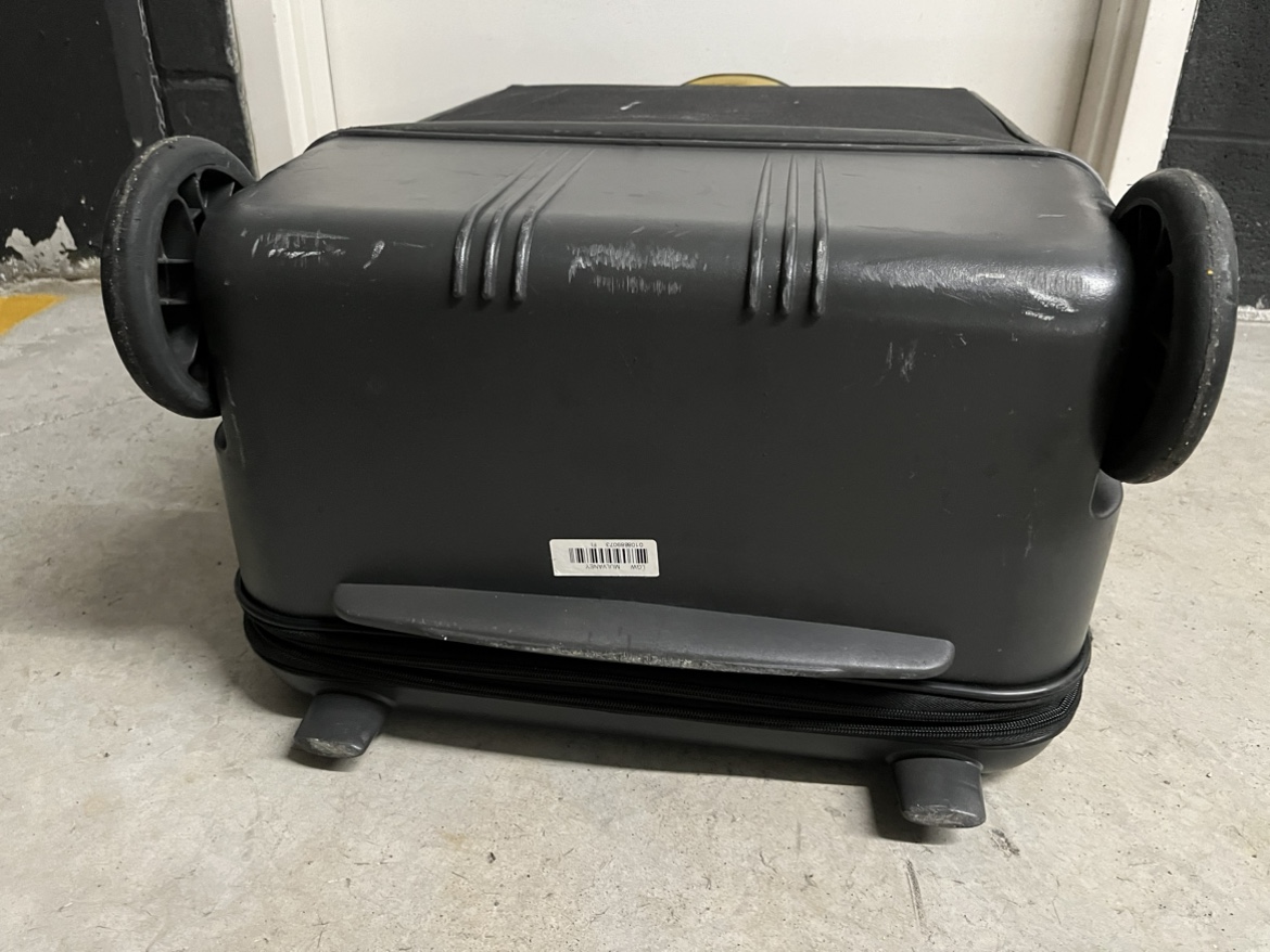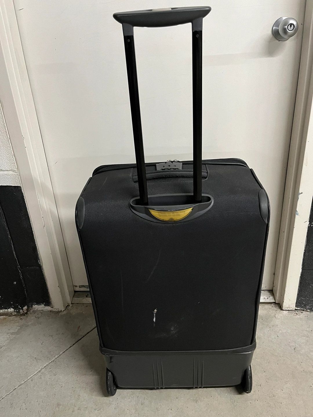 Black Samsonite suitcase with extendable handle, two wheels, and zippered exterior pockets. Interior compression straps. Wheels, handle, and zippers work well. There is a tear in the interior compartment, but it doesn’t expose the outside. See the last picture to see the tear. I don’t remember the 3 combo lock but you don’t need it to close and open the suitcase. Dimensions: 17.5 x 10 x 27 inches.