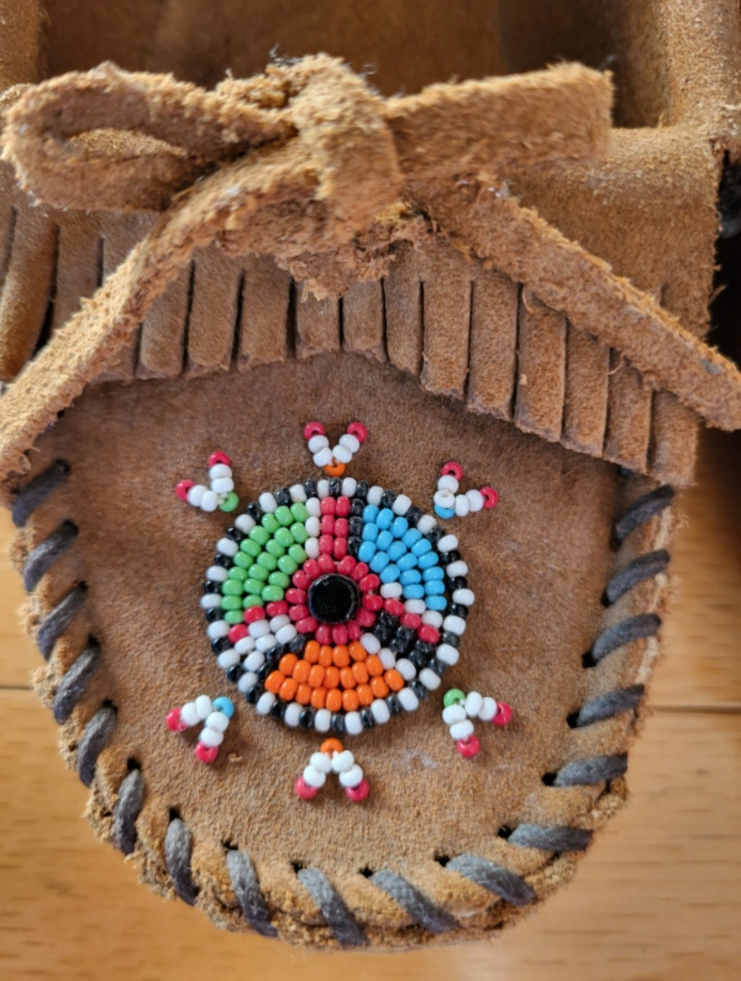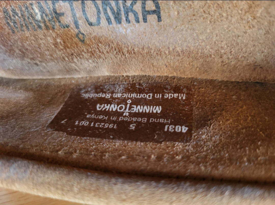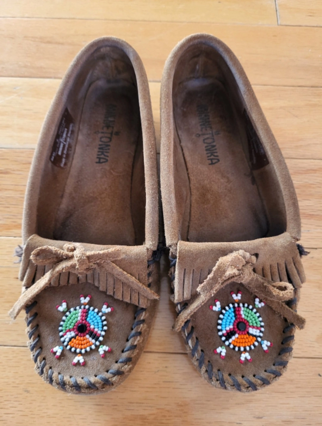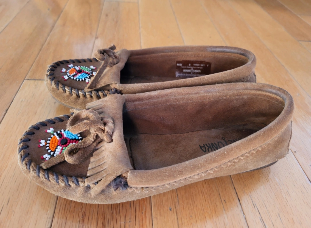 Excellent condition - worn briefly for a photo shoot. Minnetonka Moccasins "Dusty Brown" tan / camel colour. Women size 5 shoes. Please note sizing runs a full size larger so these loafers fit like a size 6 women's. Hand Beaded. Soft Suede Leather. Lightweight Sporty Rubber Sole No marks or damage. Pet free and smoke free home. Pick up at College and Shaw. Check out my other listings that might be of interest.
