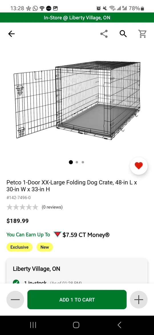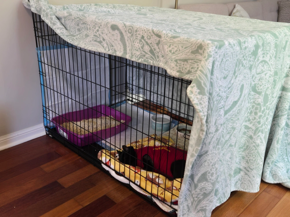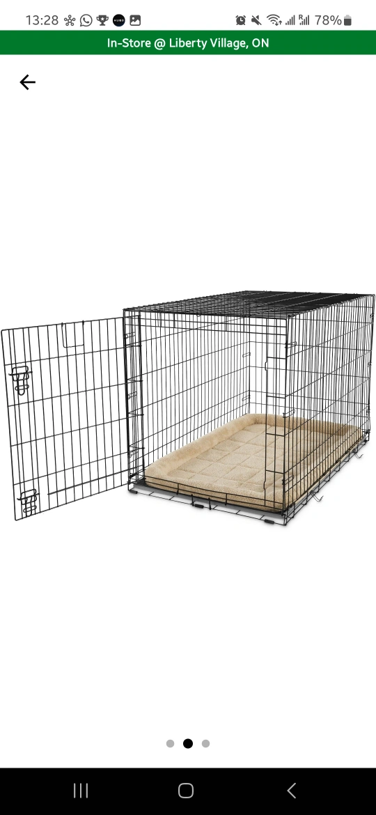 Large black metal dog crate with a single door and removable tray. Used for 2 weeks only while my cat was recovering from surgery, to keep him from exercising. Paid 190+HST for a total of $214 Bought July 25.