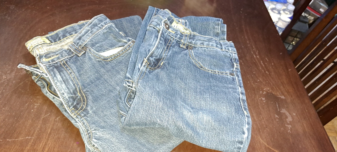 Two pairs of blue jeans. Both pairs are in good condition. They are both a straight leg style. One pair is a light wash and the other is a medium wash. Both pairs have a yellow stitch detail around the pockets. size 12-14 yr old boys very clean no rip tear or piling cash only pick up only