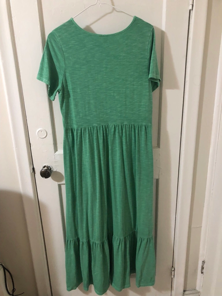 Never worn and it’s medium size. It has pockets on its side of the dress..