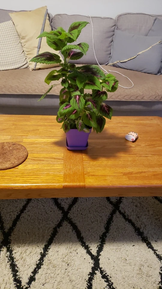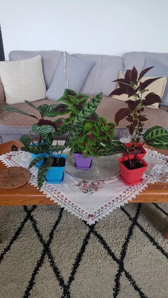 A beautiful, healthy pink and green plant in a purple pot. .. It is a beautiful addition to any home.