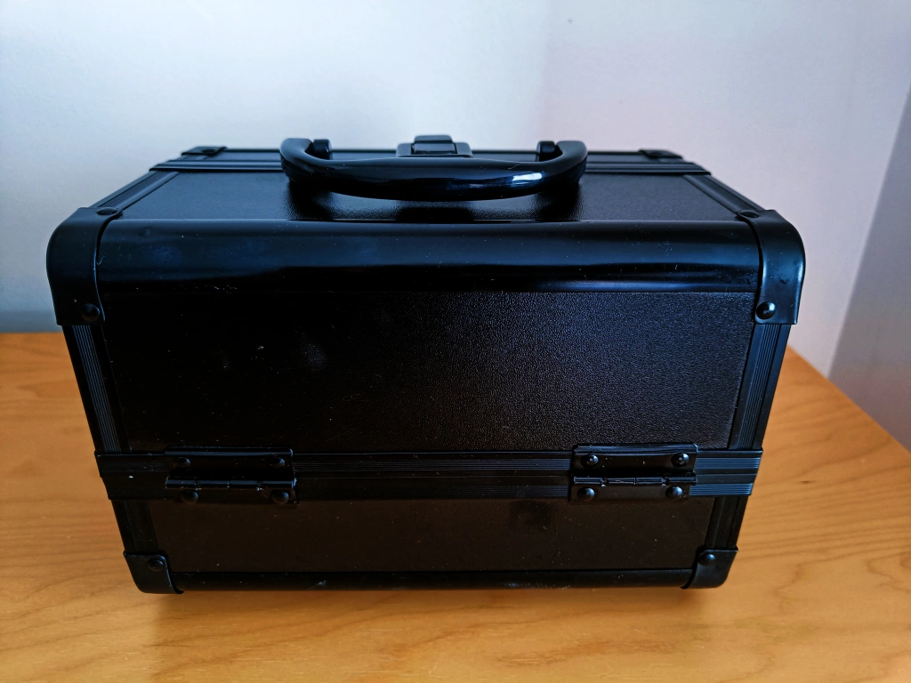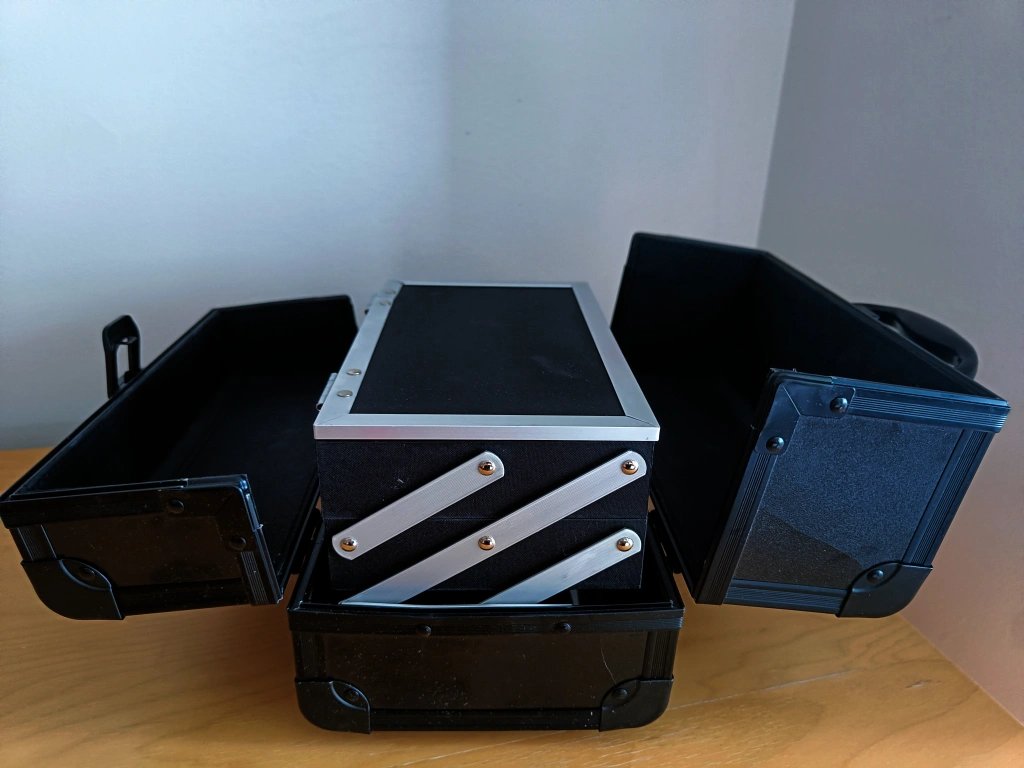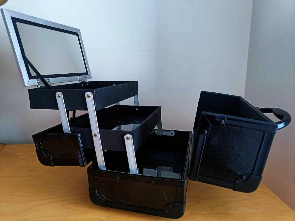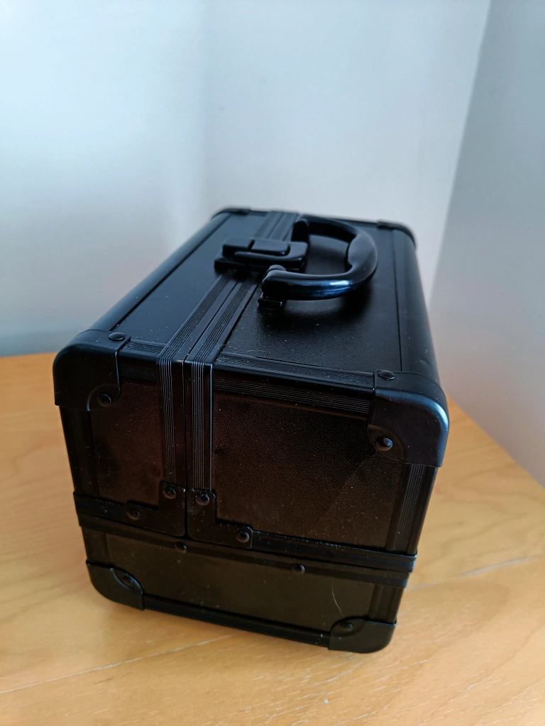 A black, portable makeup case with a handle and three compartments. excellent condition. pick up only