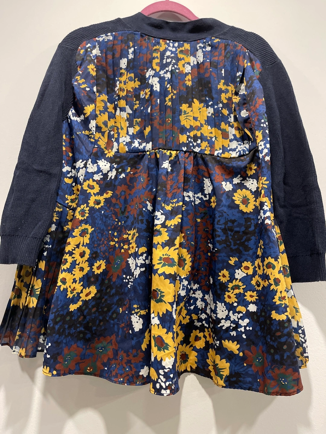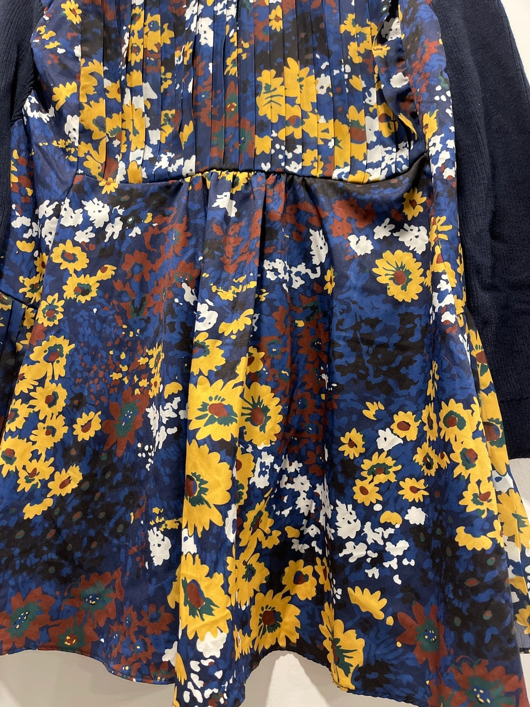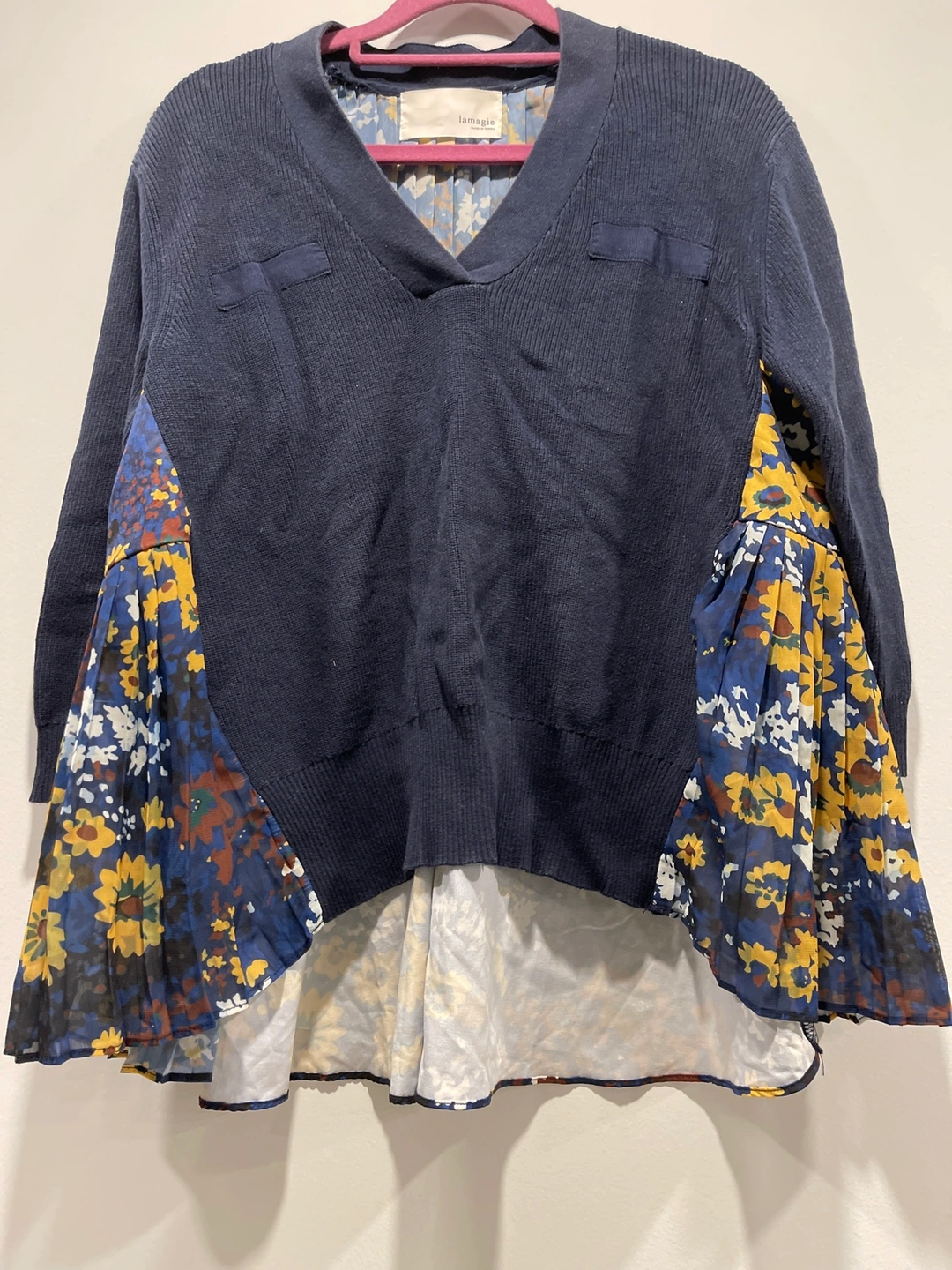Floral chiffon combines with navy blue V neck knit Made in Korea