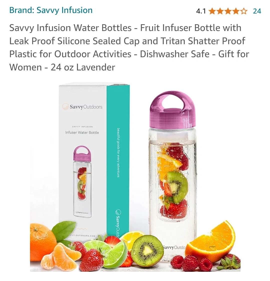 A 24 oz lavender water bottle with a fruit infuser. It is made from Tritan shatterproof plastic and includes a leak proof silicone sealed cap. This bottle is dishwasher safe. - see images for details - click image to enlarge - scroll to left to see more images PLEASE "FOLLOW" ME, AS I OFFER A VARIETY OF DIFFERENT ITEMS AT FANTASTIC PRICES! HOPE TO SEE YOU SOON! THANKS FOR YOUR TIME . Exact Cash Please - If you need change please let me know ahead of time so I can get change. BM27 S00610