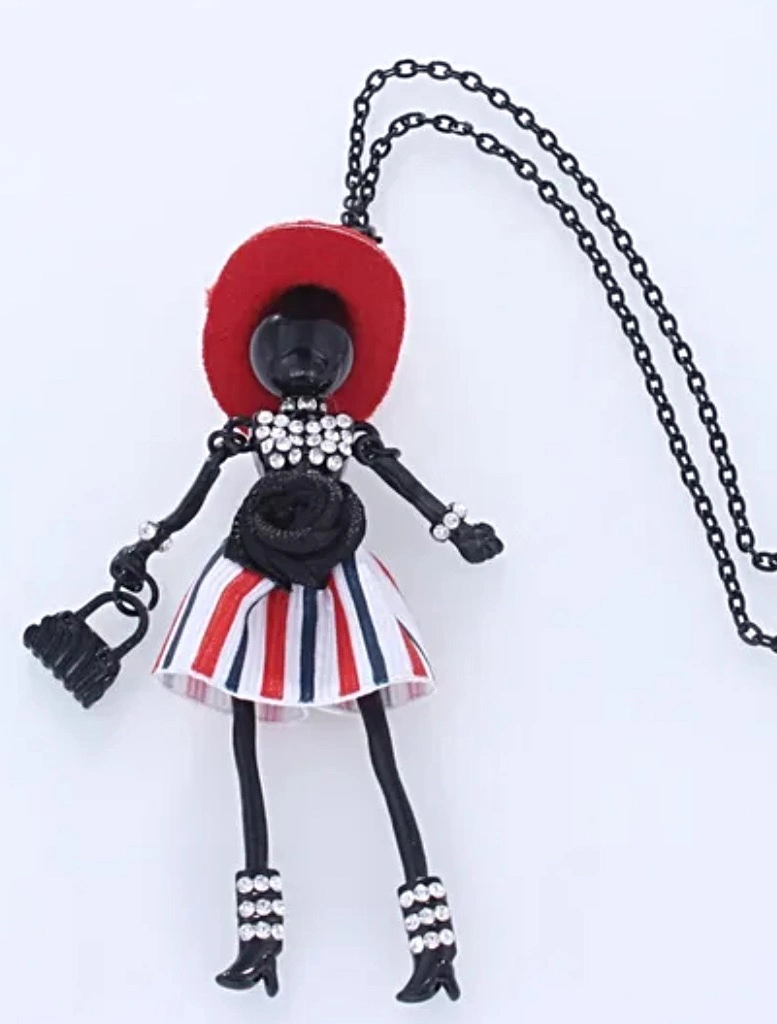 A black doll pendant with a red hat, a black dress with red and white stripes, and a black purse. The necklace has a black chain. 2018 Rhinestone Floral Stripe Dress Doll Pendant Necklace Red Hat Paris Girl Handmade Statement Jewelry For Women Collares