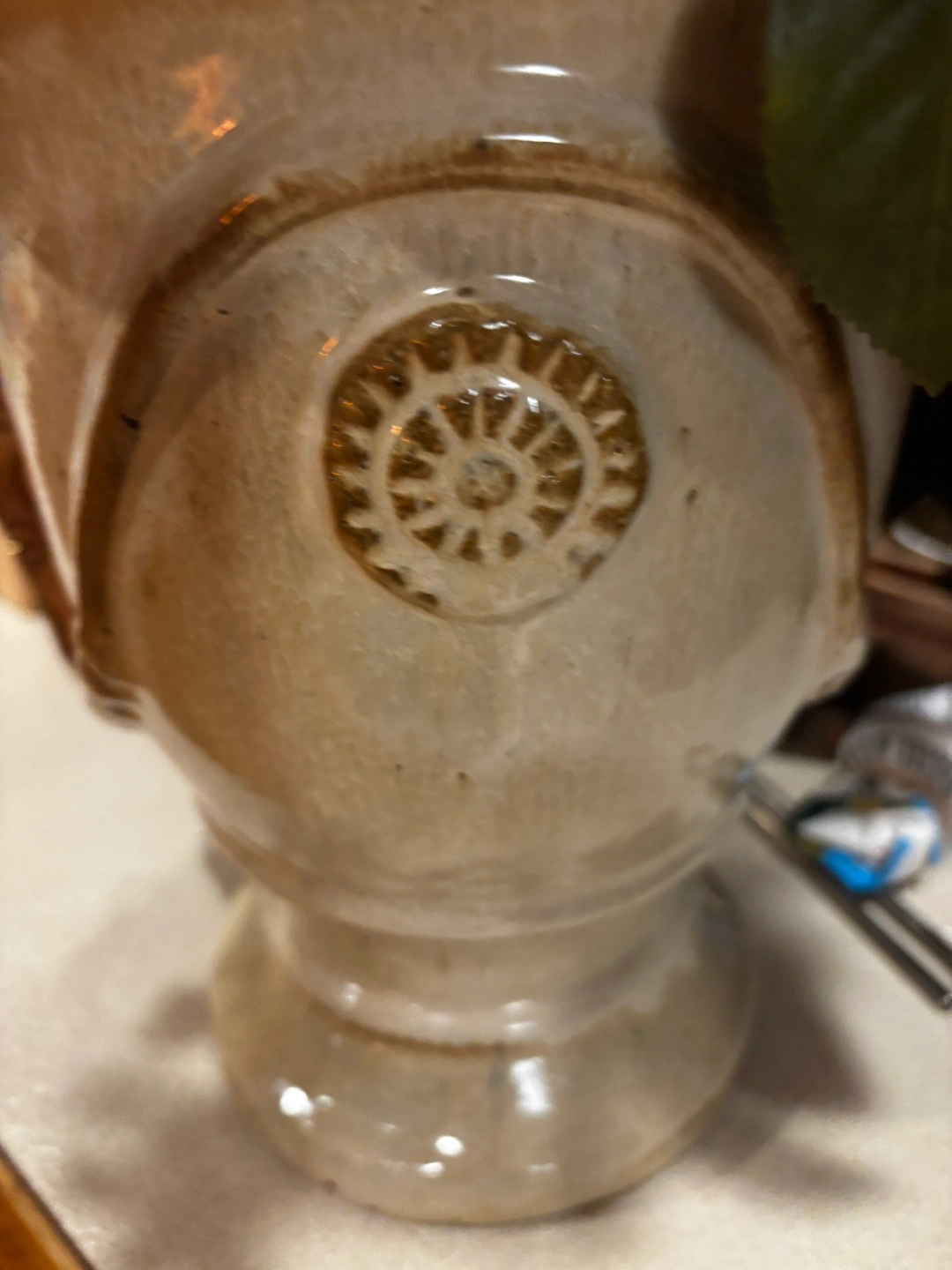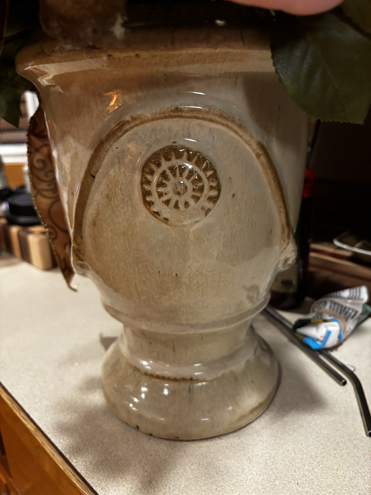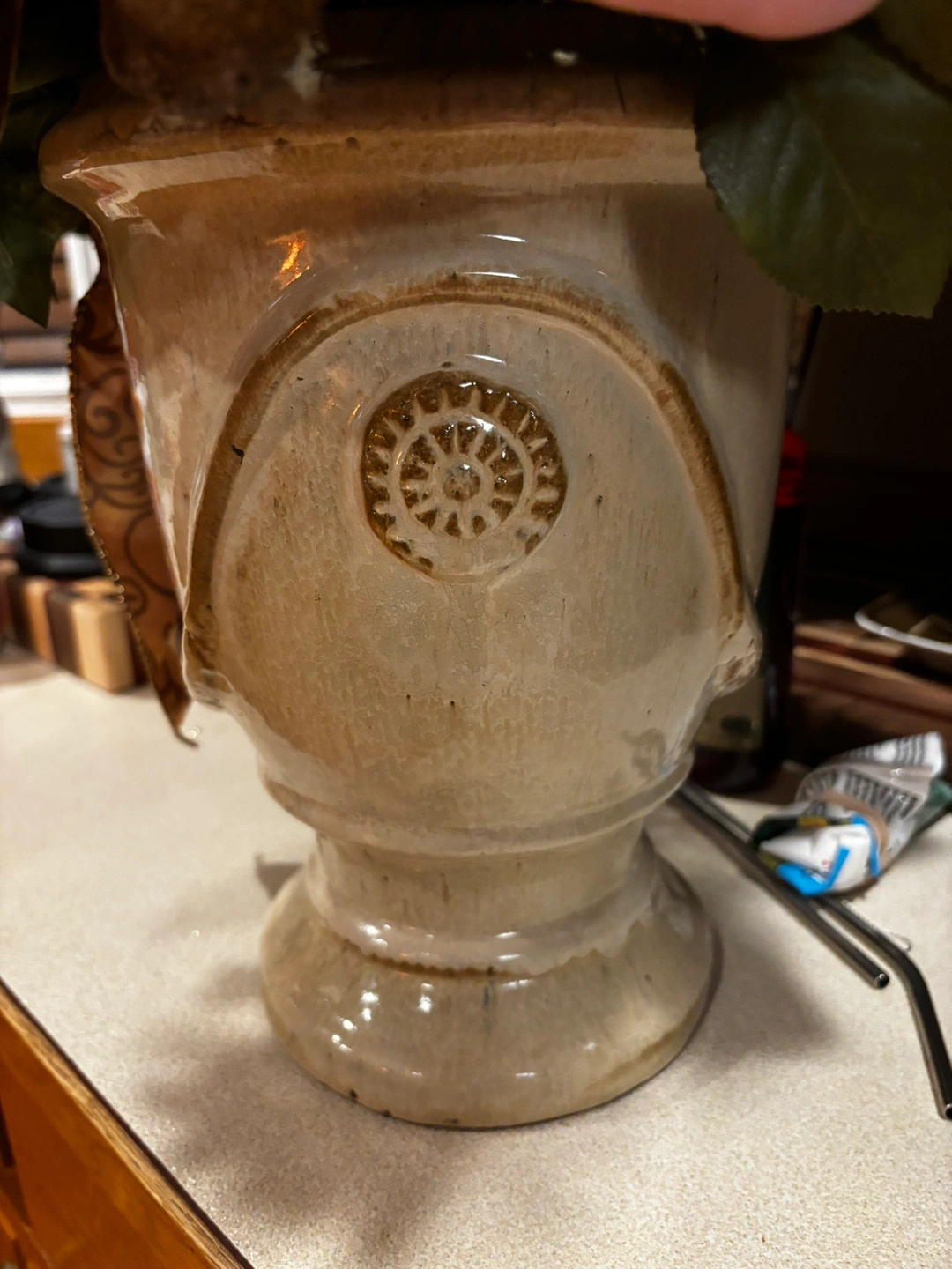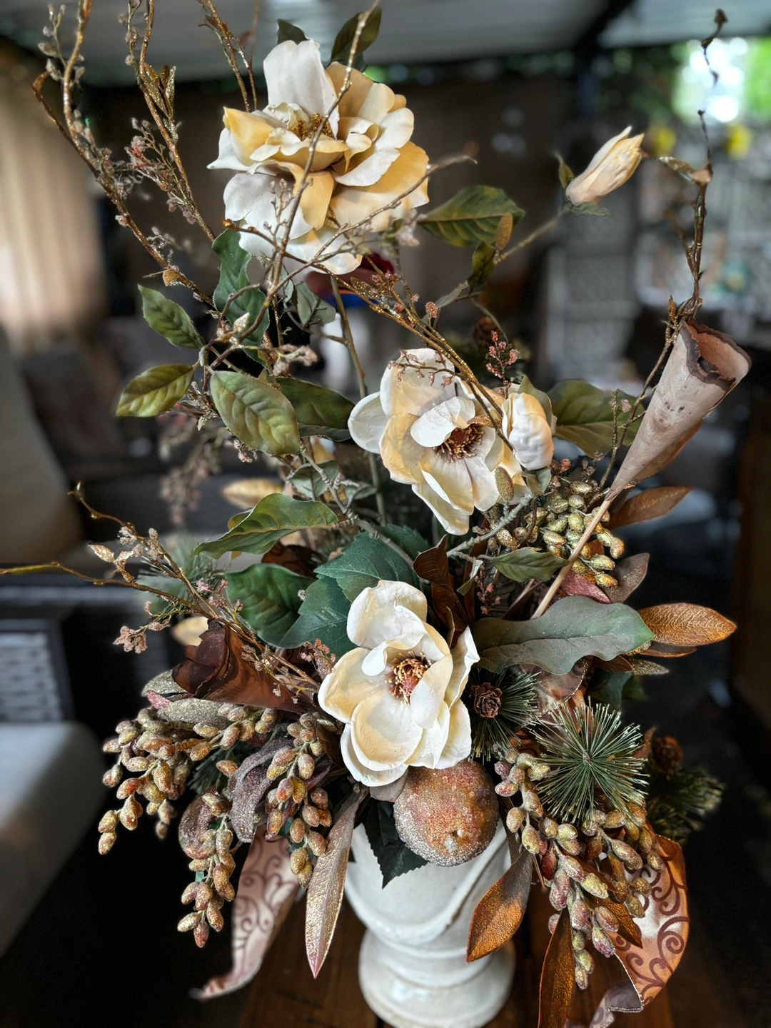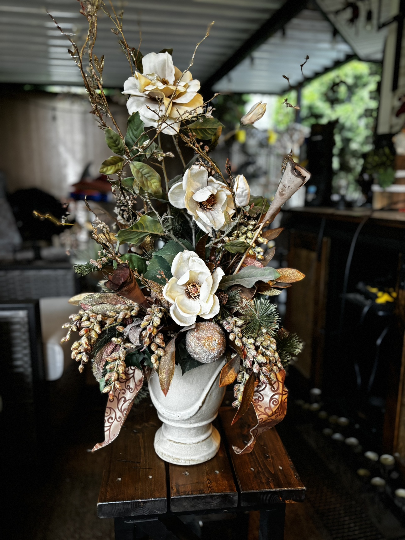 This is a glass vase with a floral arrangement. The vase is beige in colour and has a decorative design. The arrangement features white flowers with green and gold accents.