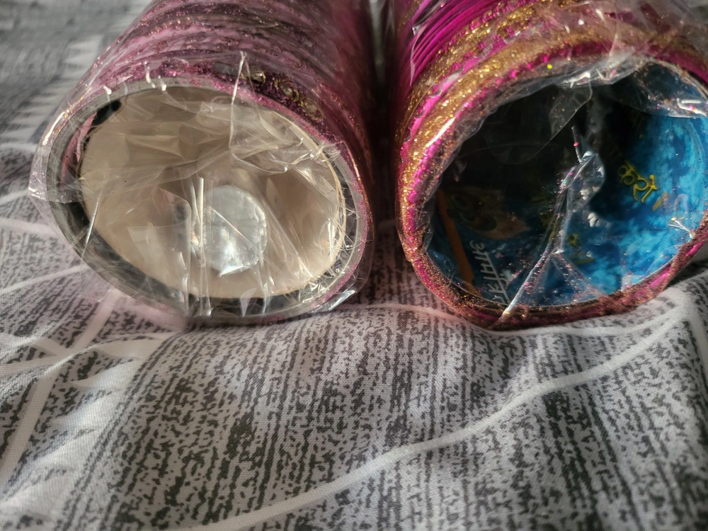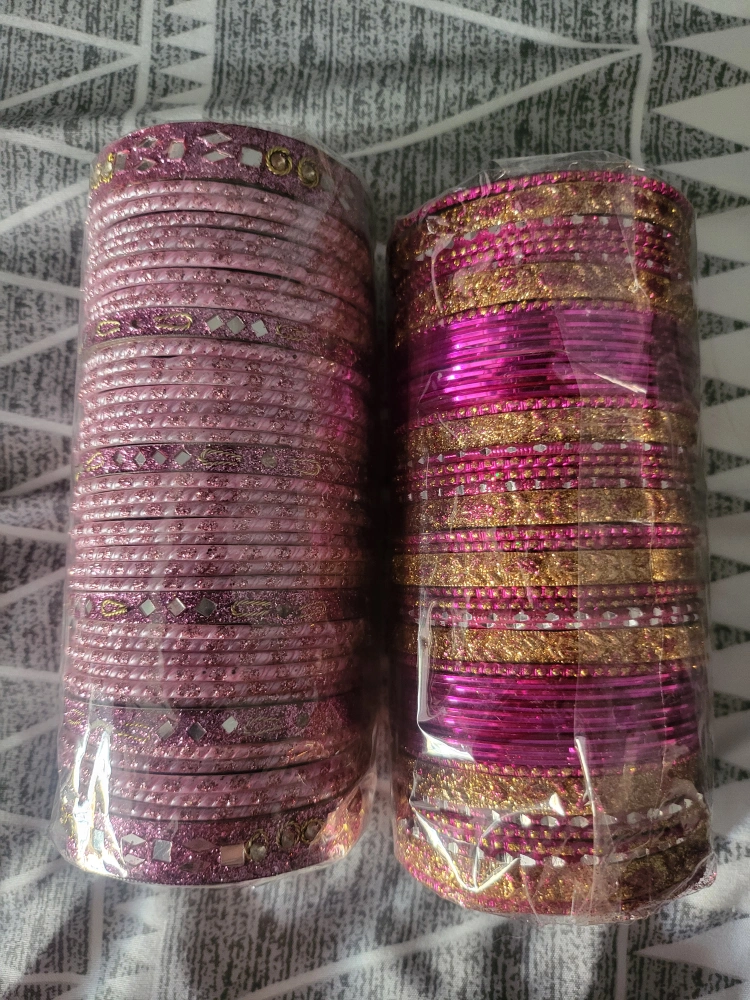 A set of two bangles, one pink and one purple. Both bangles are decorated with glitter and each set is $5.