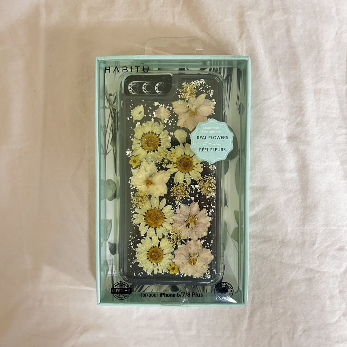 A clear phone case with real pressed flowers encased in resin. Pick up only.