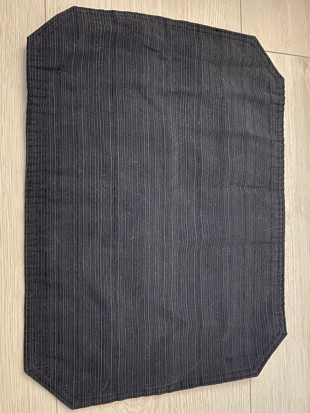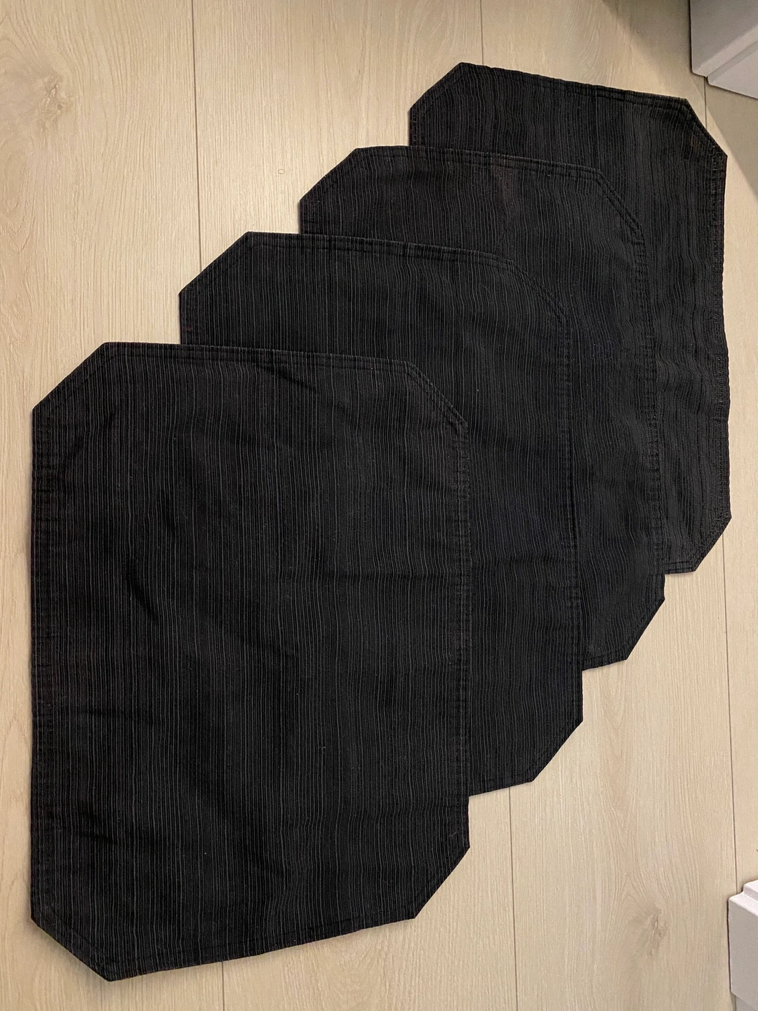 Set of 4 black placemats with a white stripe pattern. They have a unique shape and are made of a textured fabric. They are in good condition.
