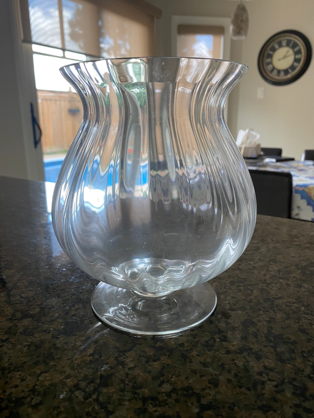 A clear pedestal glass vase with a flared top and a round base. The vase has a fluted design. It measures 7 inches tall.