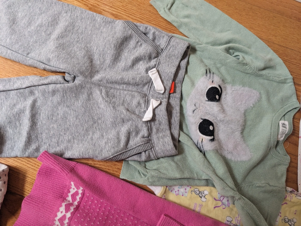 Sweat pants, pajamas (2 parts), 2 sweaters, long sleeve T-shirt, tights, panties and 2 sleeveless cotton tops. The price is for all ten items
