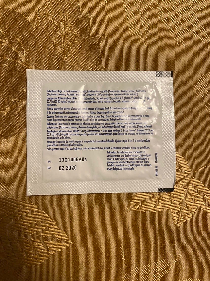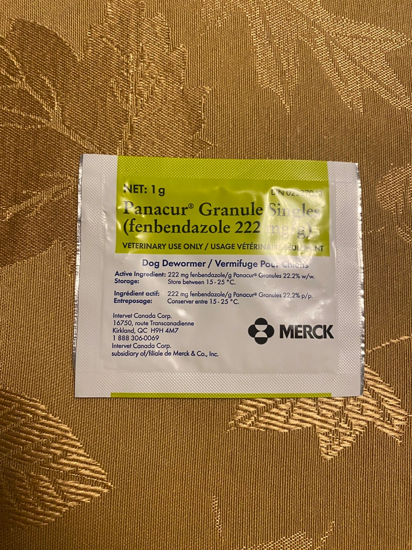 Brand new in packaging! Multiple available Panacur Granule Singles Dog dewormer 222 mg fenbendazole per packet Dosage and Administration: DOGS: 50 mg fenbendazole / kg body weight (equivalent to 5 g Panacur® Granules 22.2% per 22.7 kg (50 lb) weight) each day for three consecutive days, for the treatment of ascarids, hookworms, whipworms and tapeworms. Mix the appropriate amount of drug with a small amount of the usual food. Dry food may require moistening to facilitate mixing. If the entire amount is not consumed or if vomiting follows, deworming will not have occurred. *Caution: Treatment may cause emesis or slight diarrhea in some dogs. One of the benzimidazoles has been reported to cause clinical hepatotoxicity in canines. However, this effect has not been reported during the clinical use of fenbendazole. Consult with your veterinarian should you require assistance on dosage and administration.