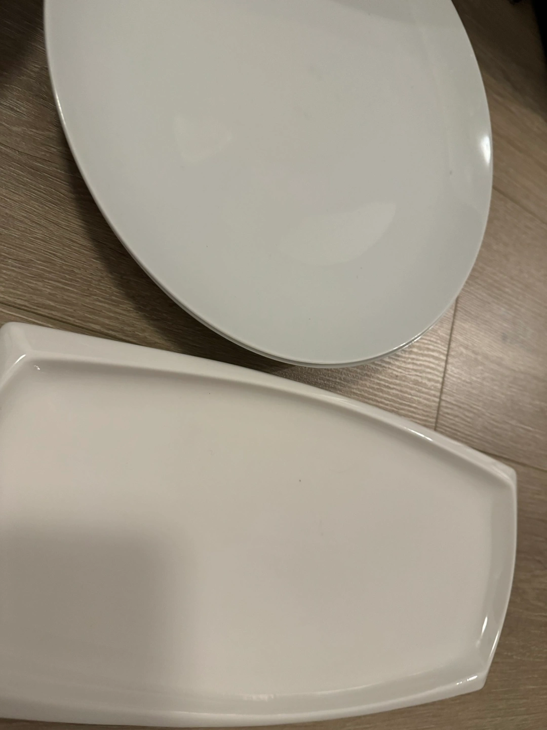 A large white platter that is perfect for serving food. It is in excellent condition. 3pcs of round one + 1pc of rectangle Totally $15 50dunfield ave pickup only