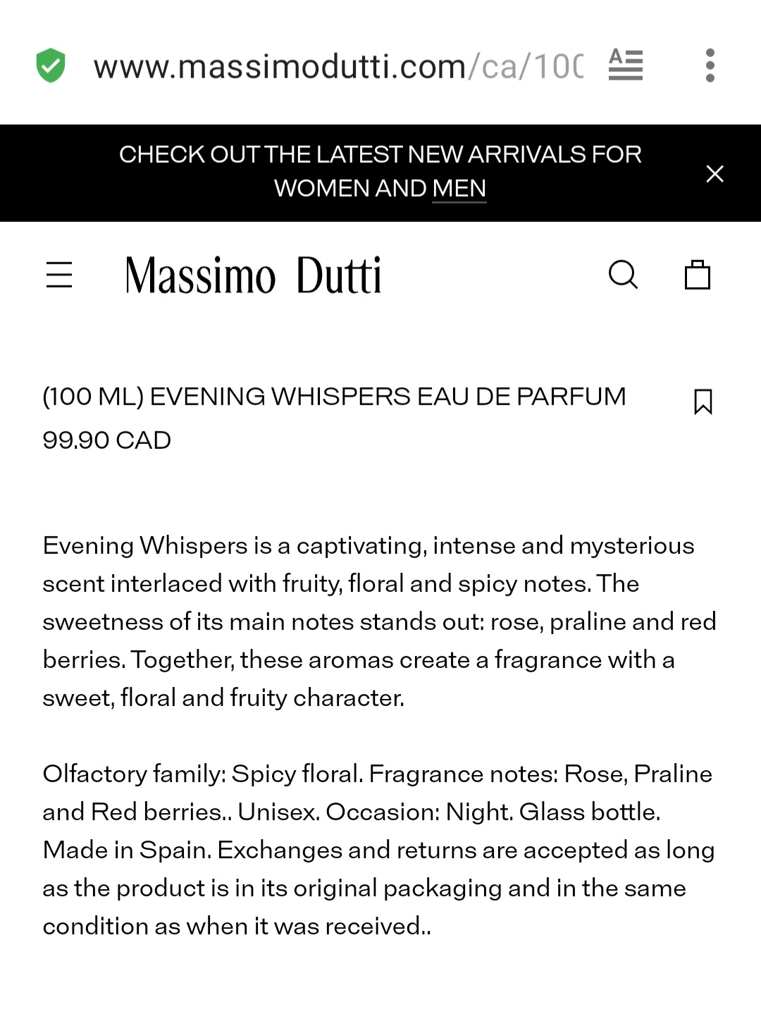 Evening Whispers eau de parfum by Massimo Dutti. Just over 2/3 left. 100mL bottle. No box. Square bottle with mahogany red cap and gold detailing. Given to me by a friend after she had grown out of the scent but it is too sweet for my taste. Retails for $99.90 on the Massimo Dutti website and at ZARA. Pickup preferably on the west end but can meetup partway on the subway line. Cash only.