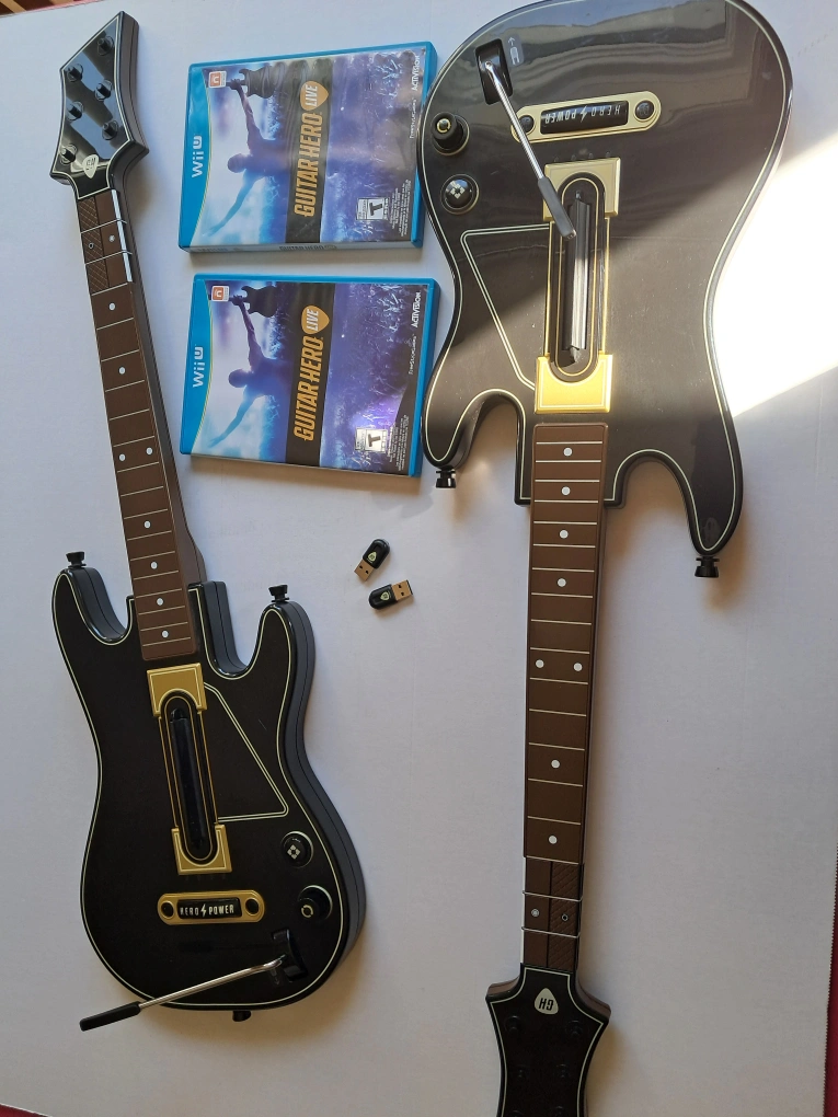 selling two sets or guitar hero live wii u each set is $50 1 guitar, 1 dongle, and wii u game guitar hero live. guitar and dongle can be used on ps3
