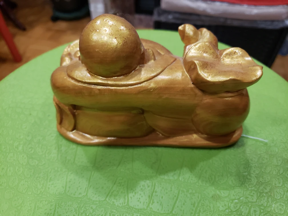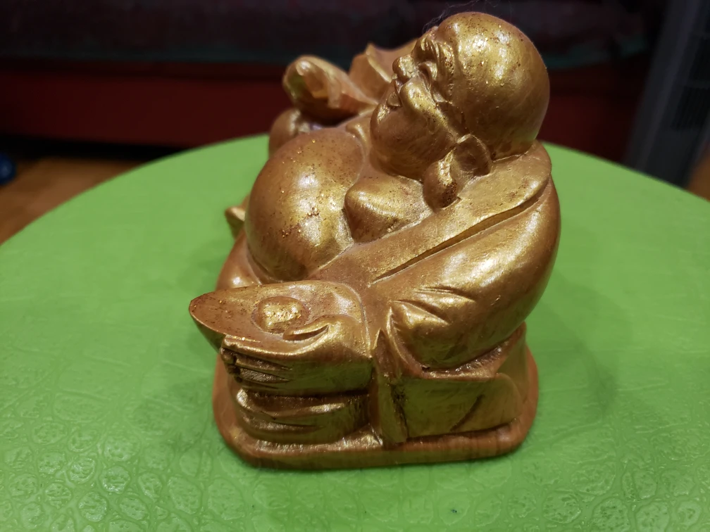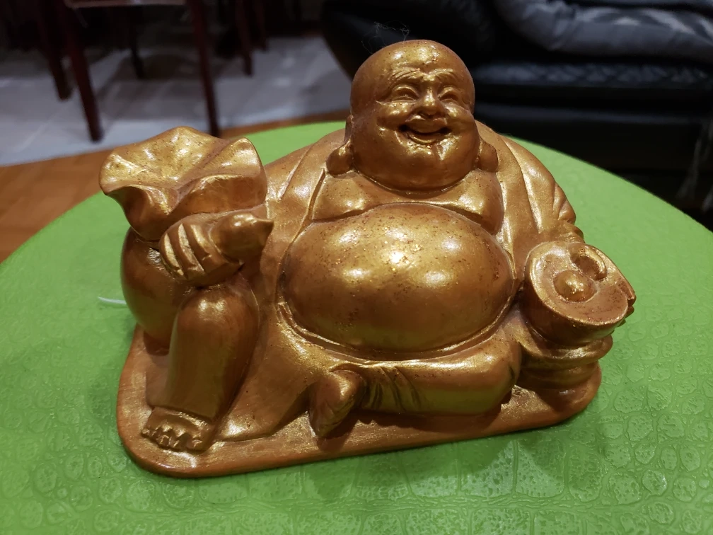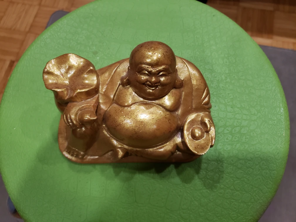 A small golden statue of the Buddha, holding a sack of money in one hand and a round object in the other.