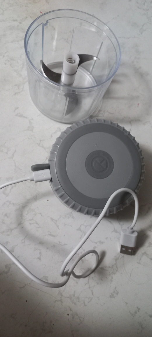 Cordless food chopper with a USB charging cord. Includes a chopping blade, a container, and a base.