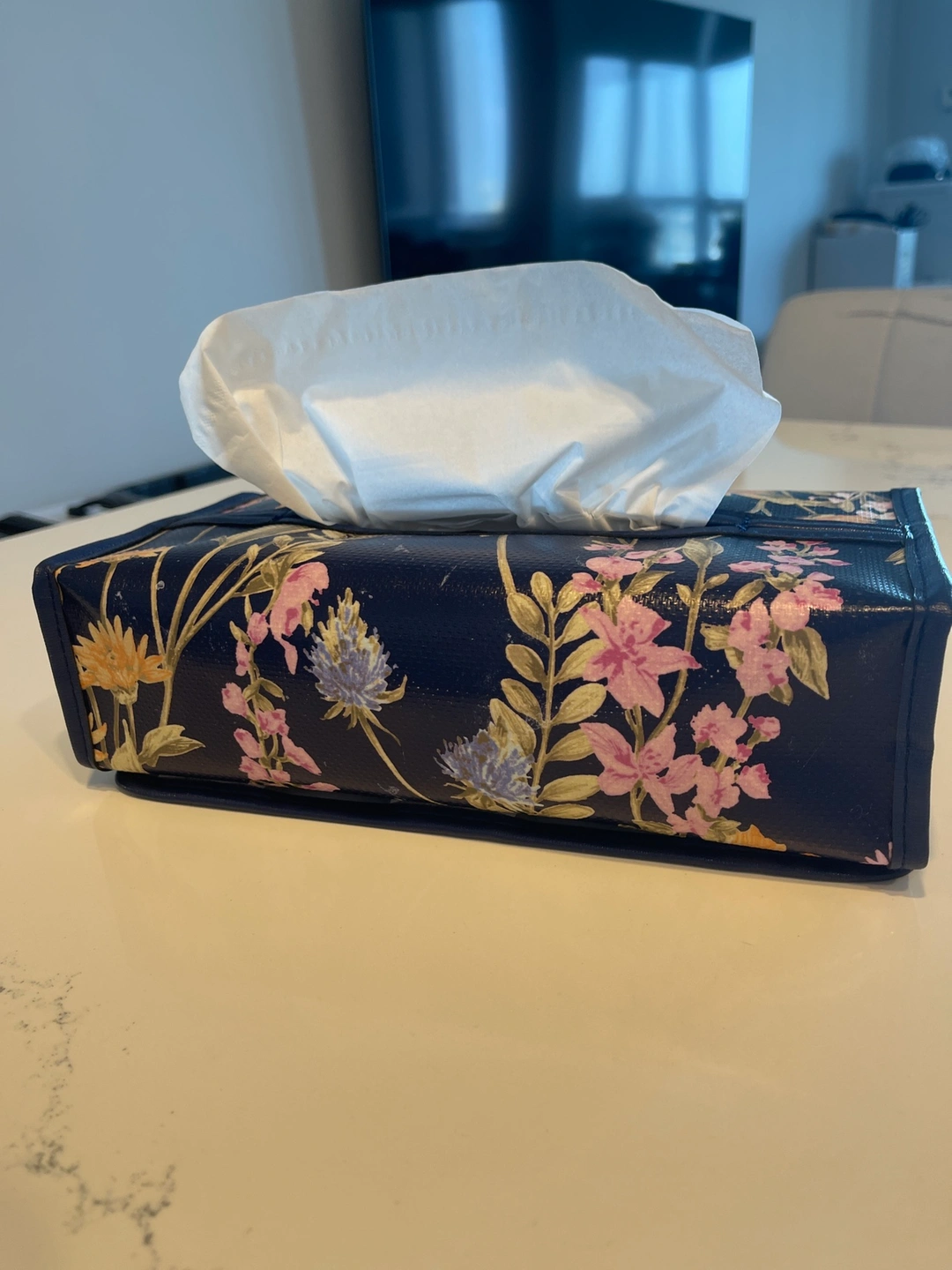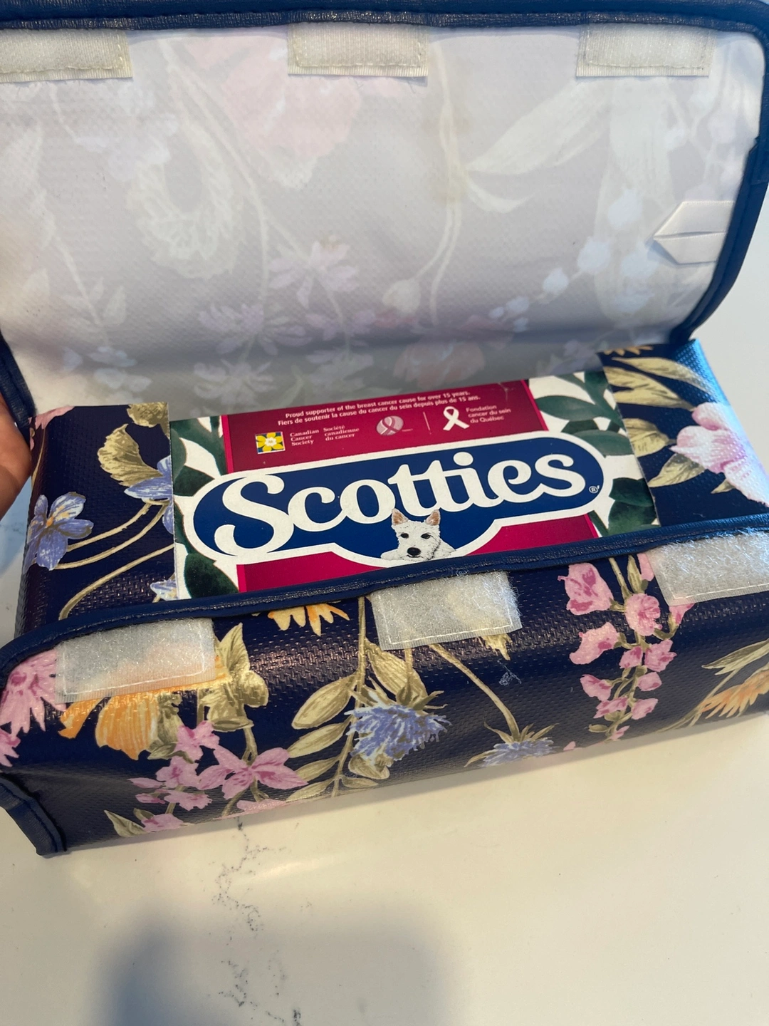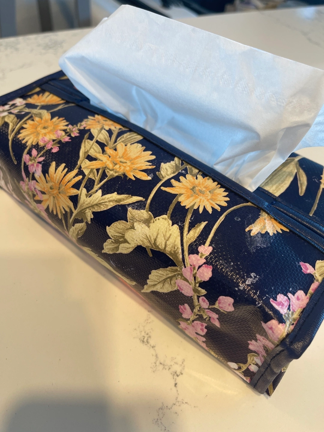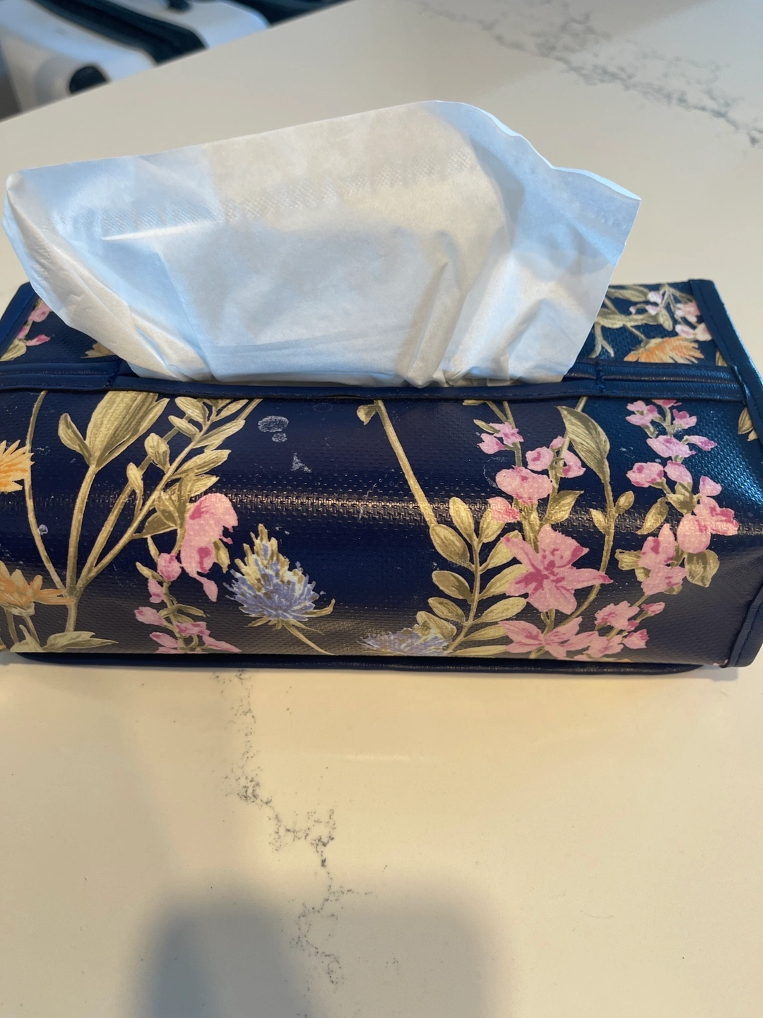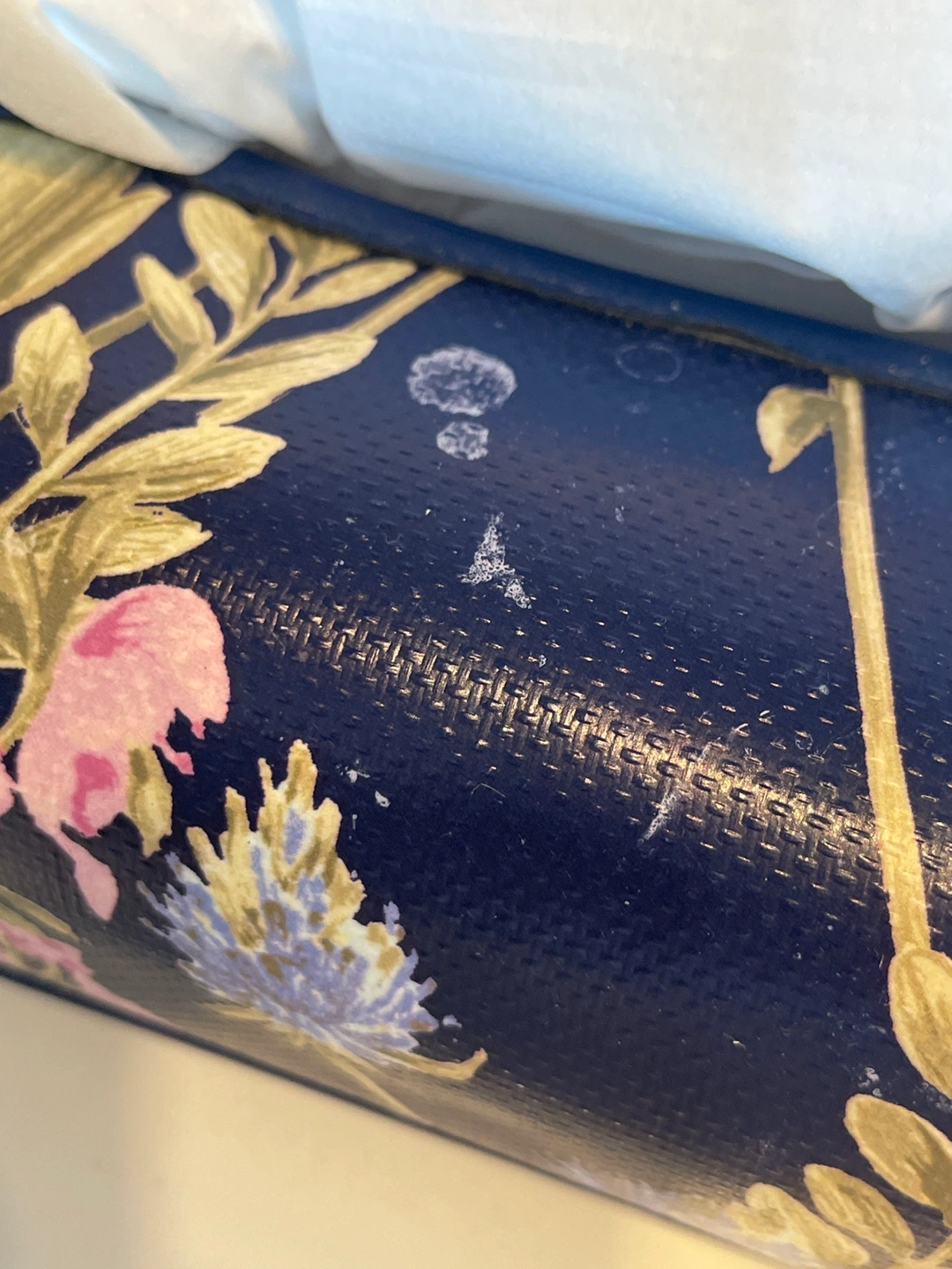 Blue and pink floral design with a leather trim