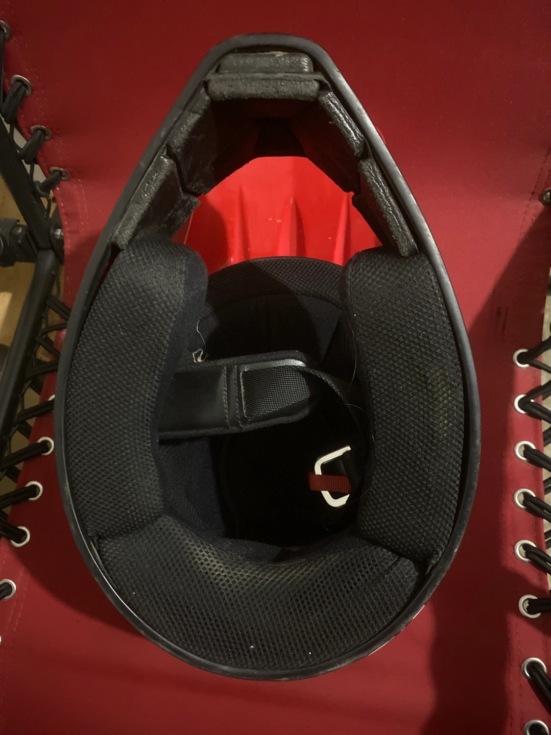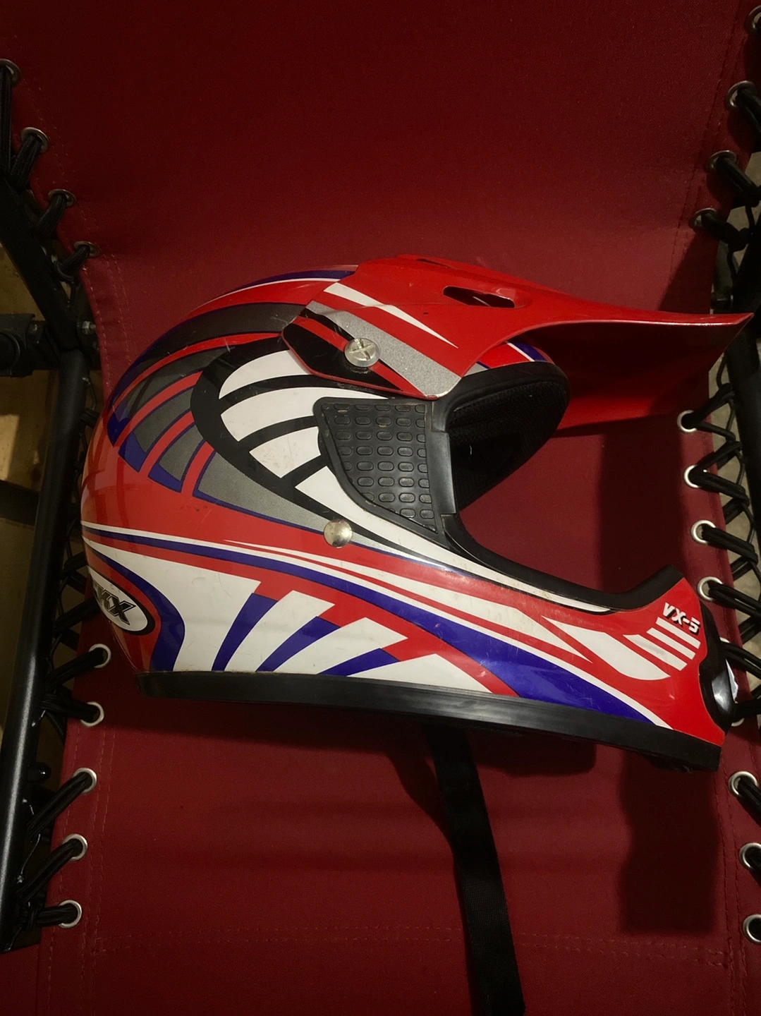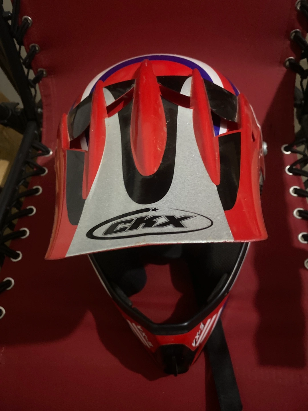 Red, white and blue helmet with black accents. Visor included. Size Xs The helmet has a strap that adjusts to fit the head. It is designed for use with a motorcycle.