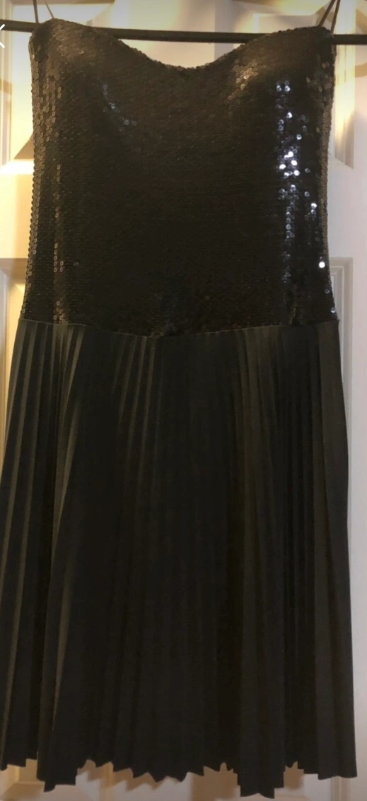 A black dress with sequin bodice and pleated skirt. The dress is sleeveless and strapless. The skirt is a-line. It is a good dress for parties and special occasions. Pick up @ midtown, cash only🤗