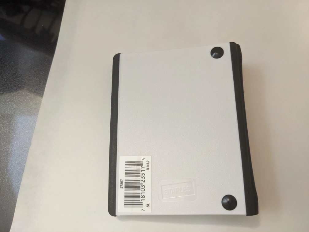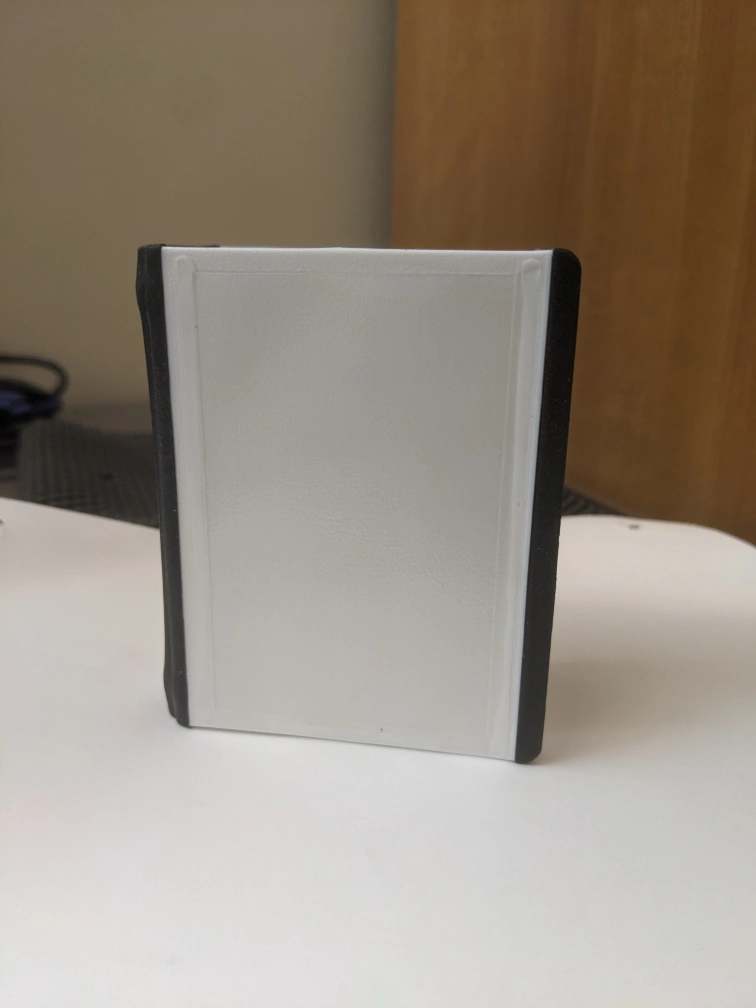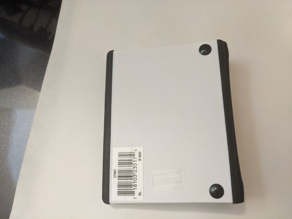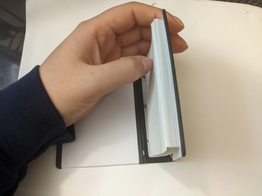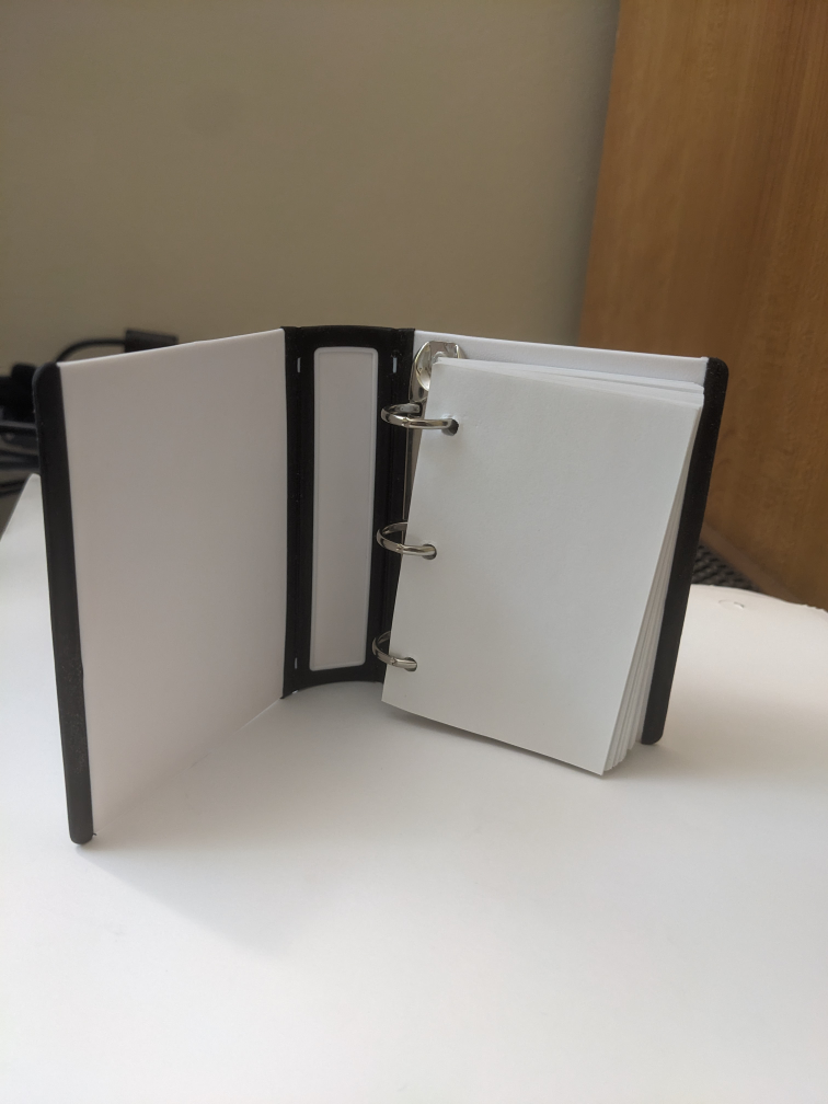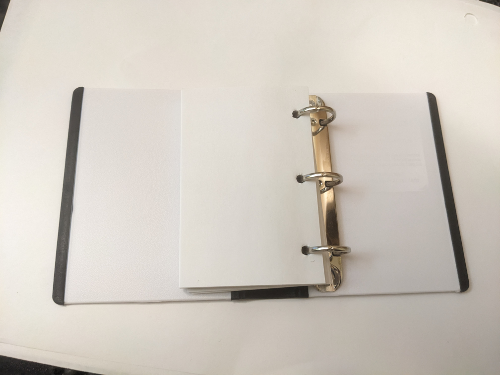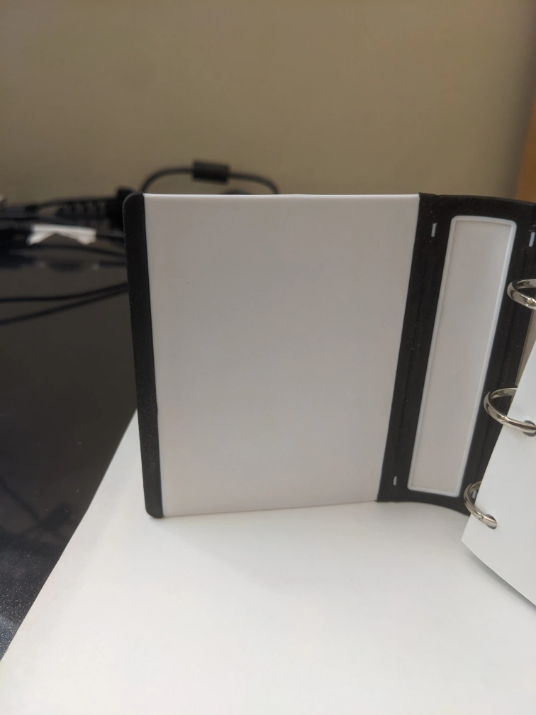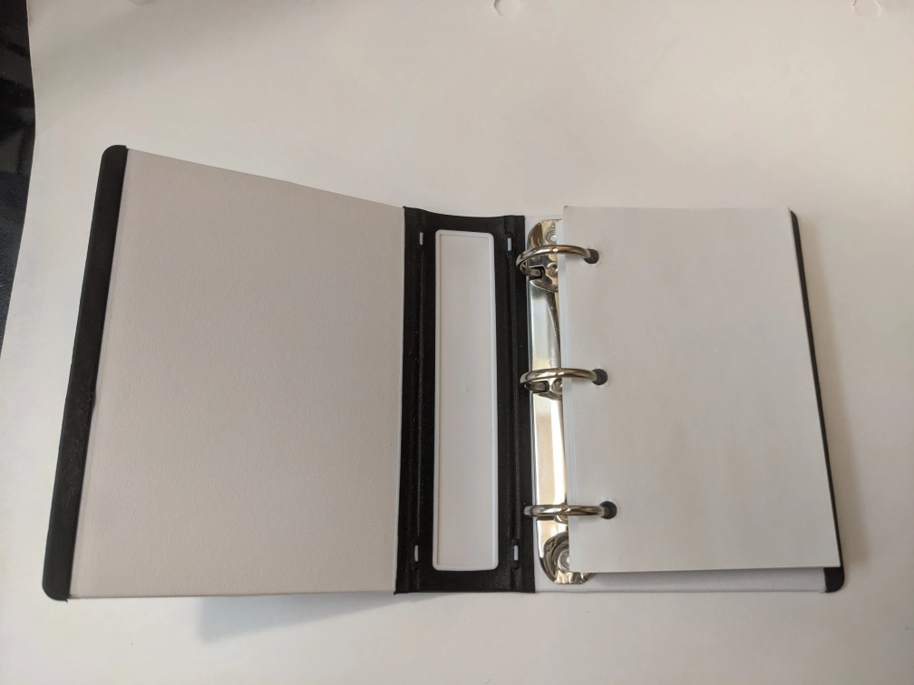 Other Details: - About 3" by 4" - Plenty of paper inside binder - White binder, dark grey binding