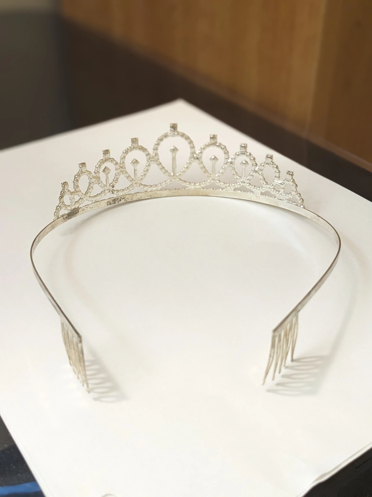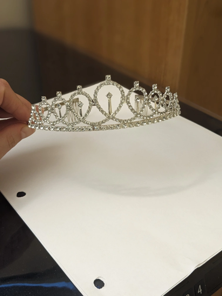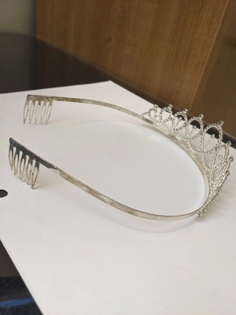 Silver tiara with rhinestones. The tiara has a flexible band with combs on either side for holding it in place.