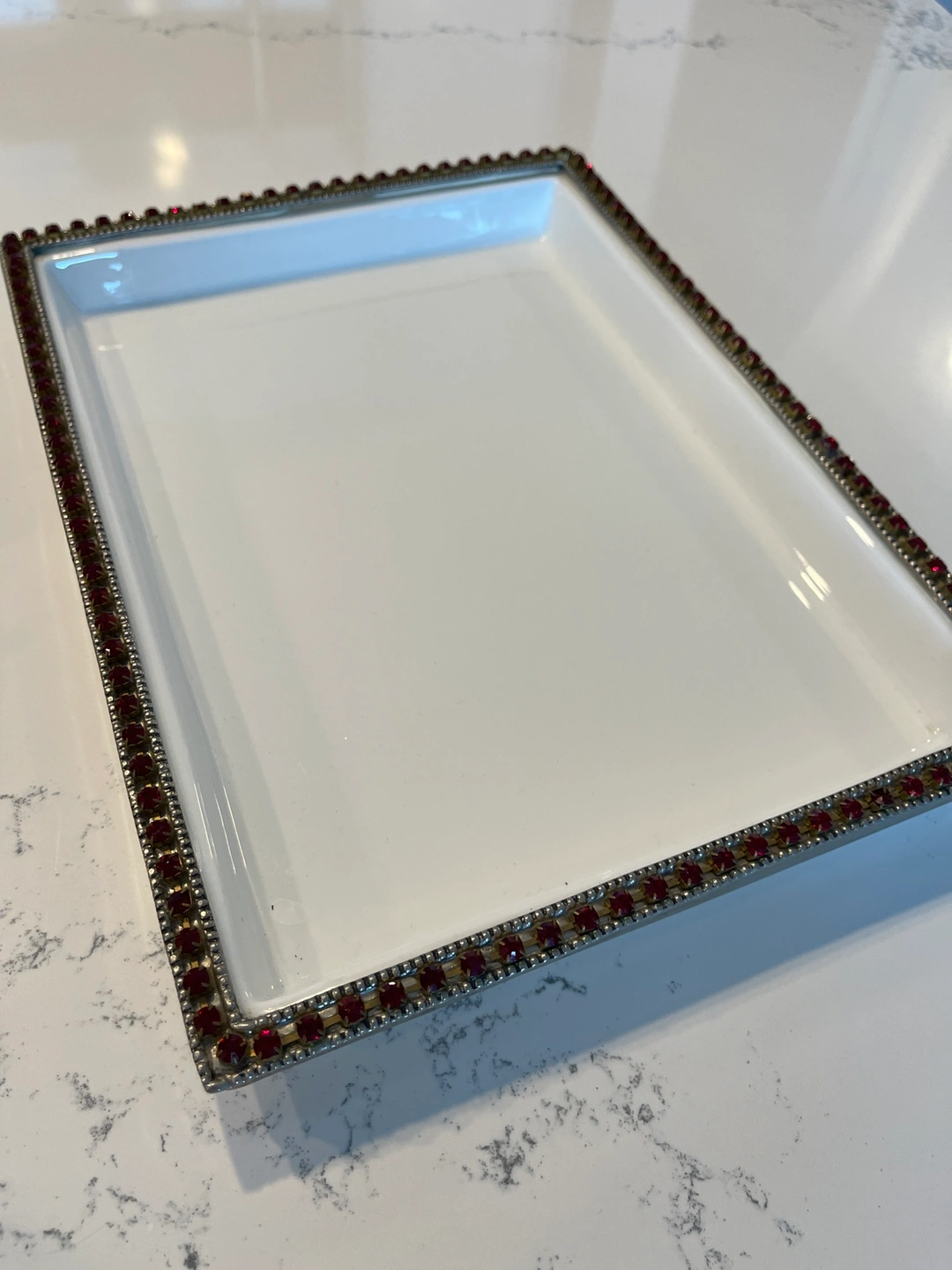A decorative tray with a white porcelain base and a silver rim trimmed with red rhinestones. It is perfect for organizing jewellery or other small items or food A bit Heavy