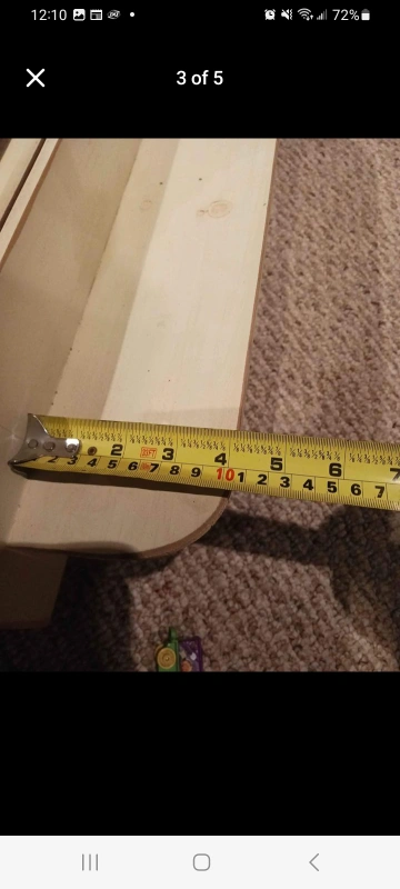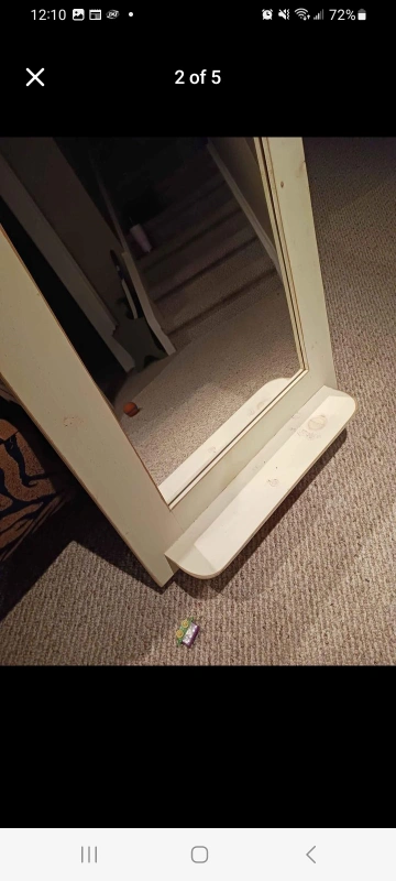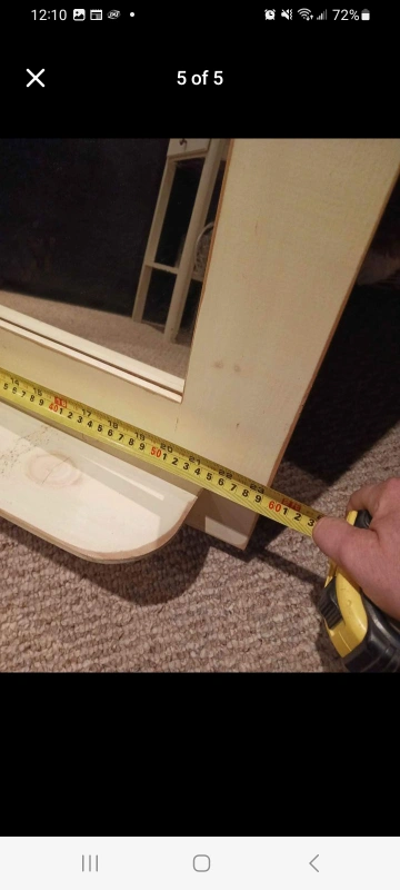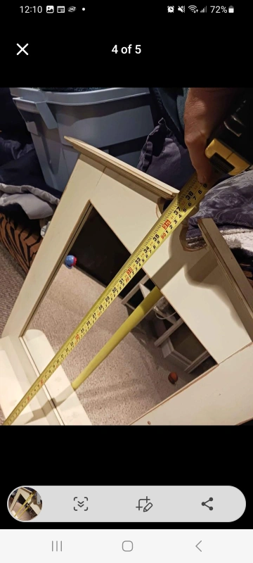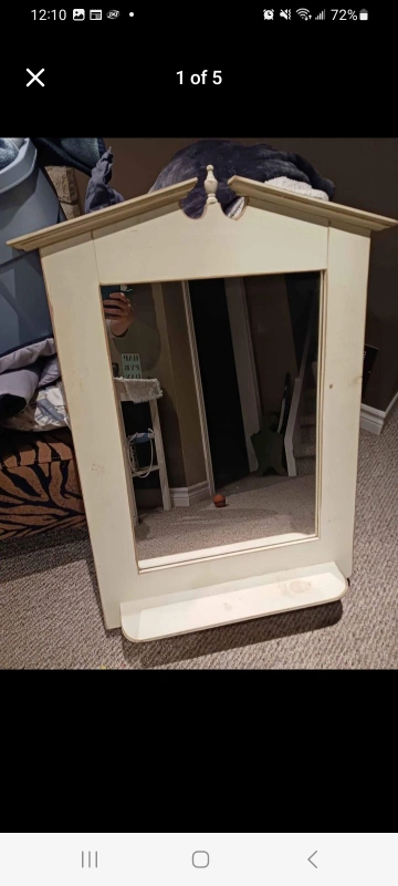 This mirror features a white/creamy yellow wooden frame with a shelf. It measures 23 inches in width and 38 inches in height. It would look lovely in any front hall or bedroom. Brand new, purchased but didn't fit the area it was purchased for.