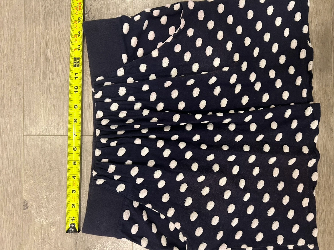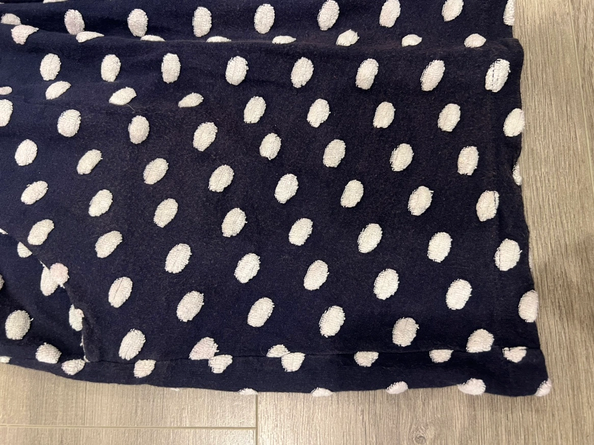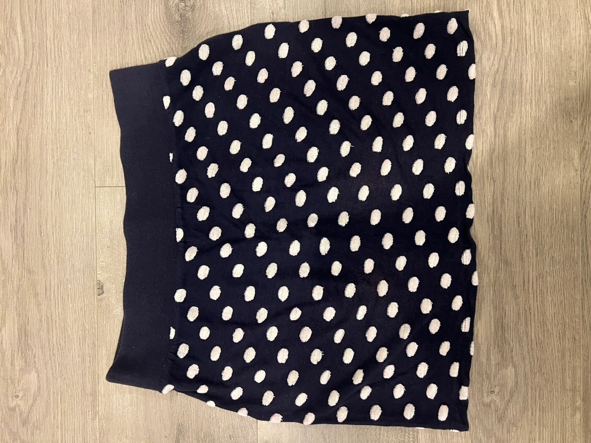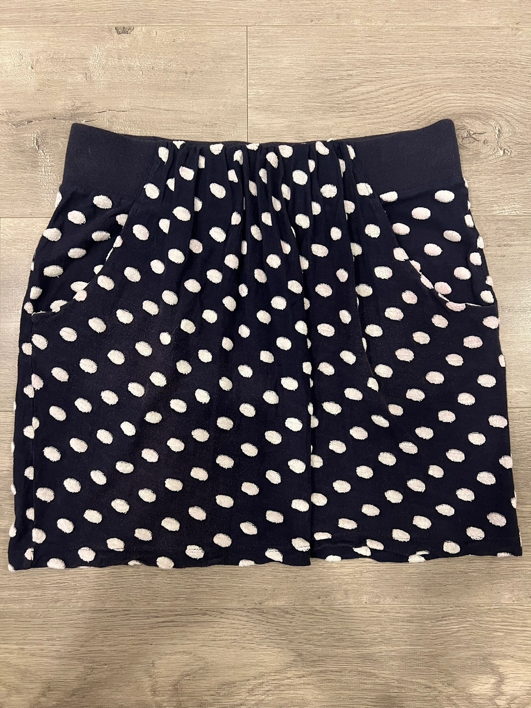 A navy blue polka dot skirt with an elastic waistband and pockets Small but flexible