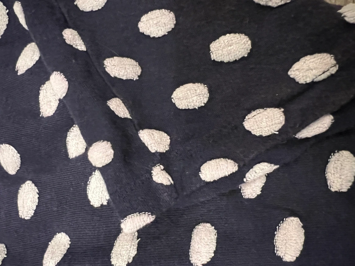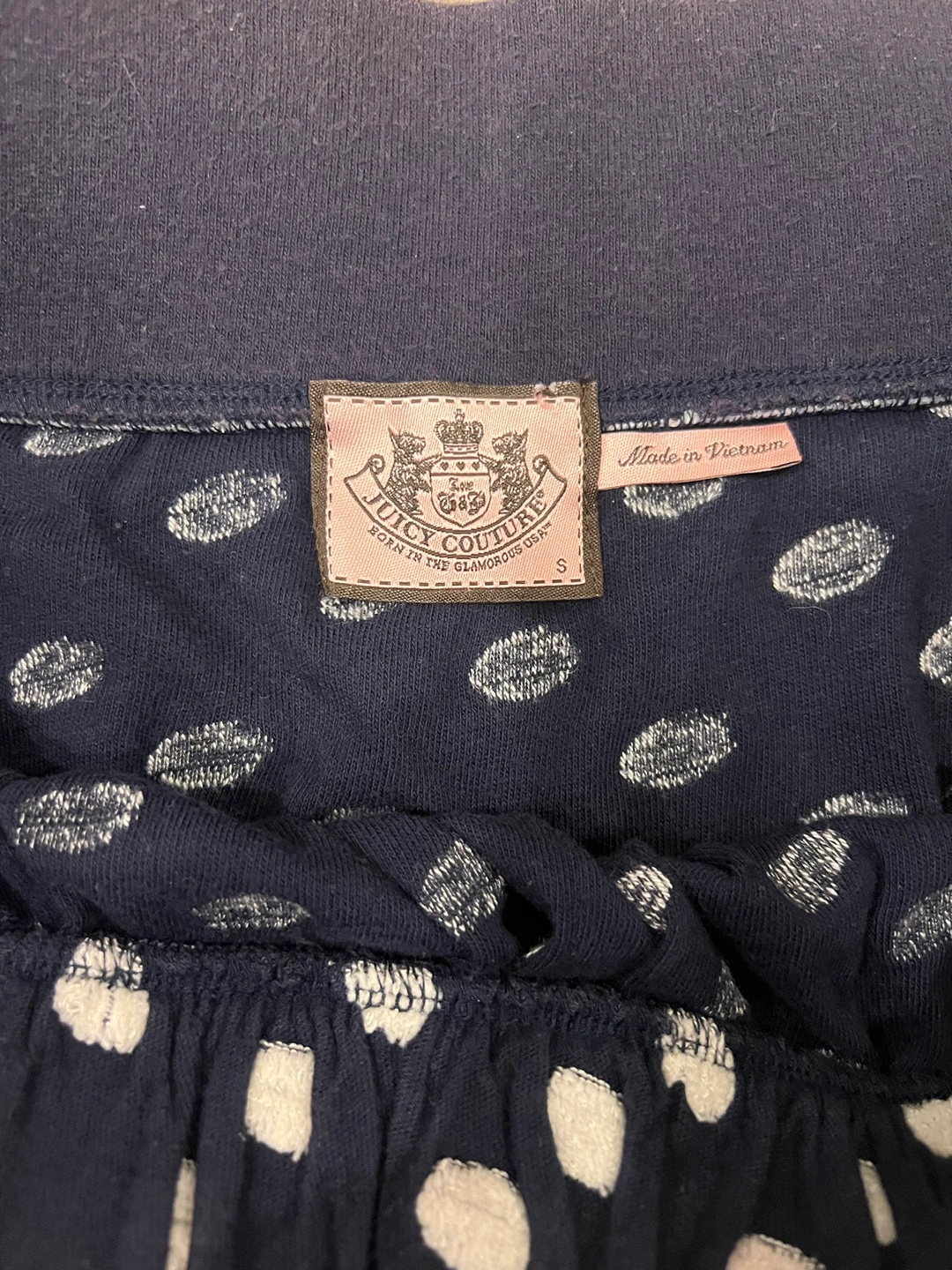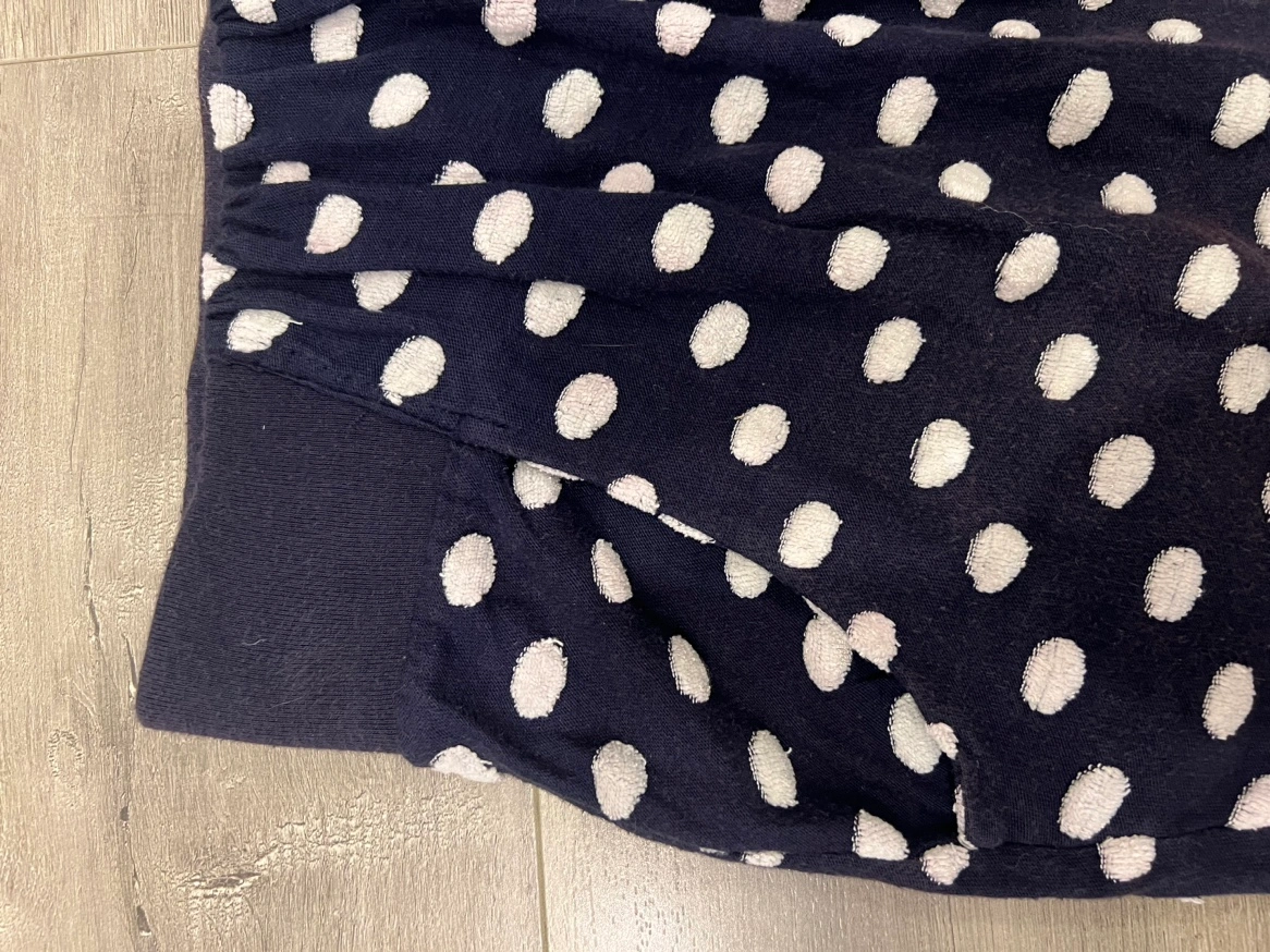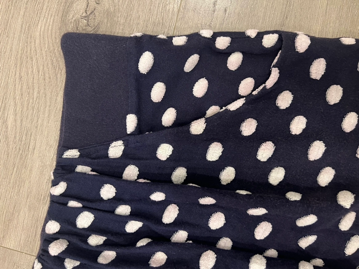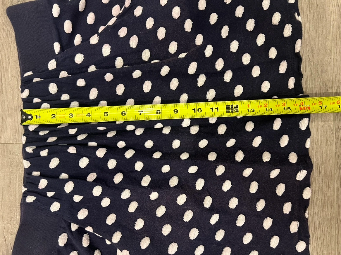 A navy blue polka dot skirt with an elastic waistband and pockets Small but flexible