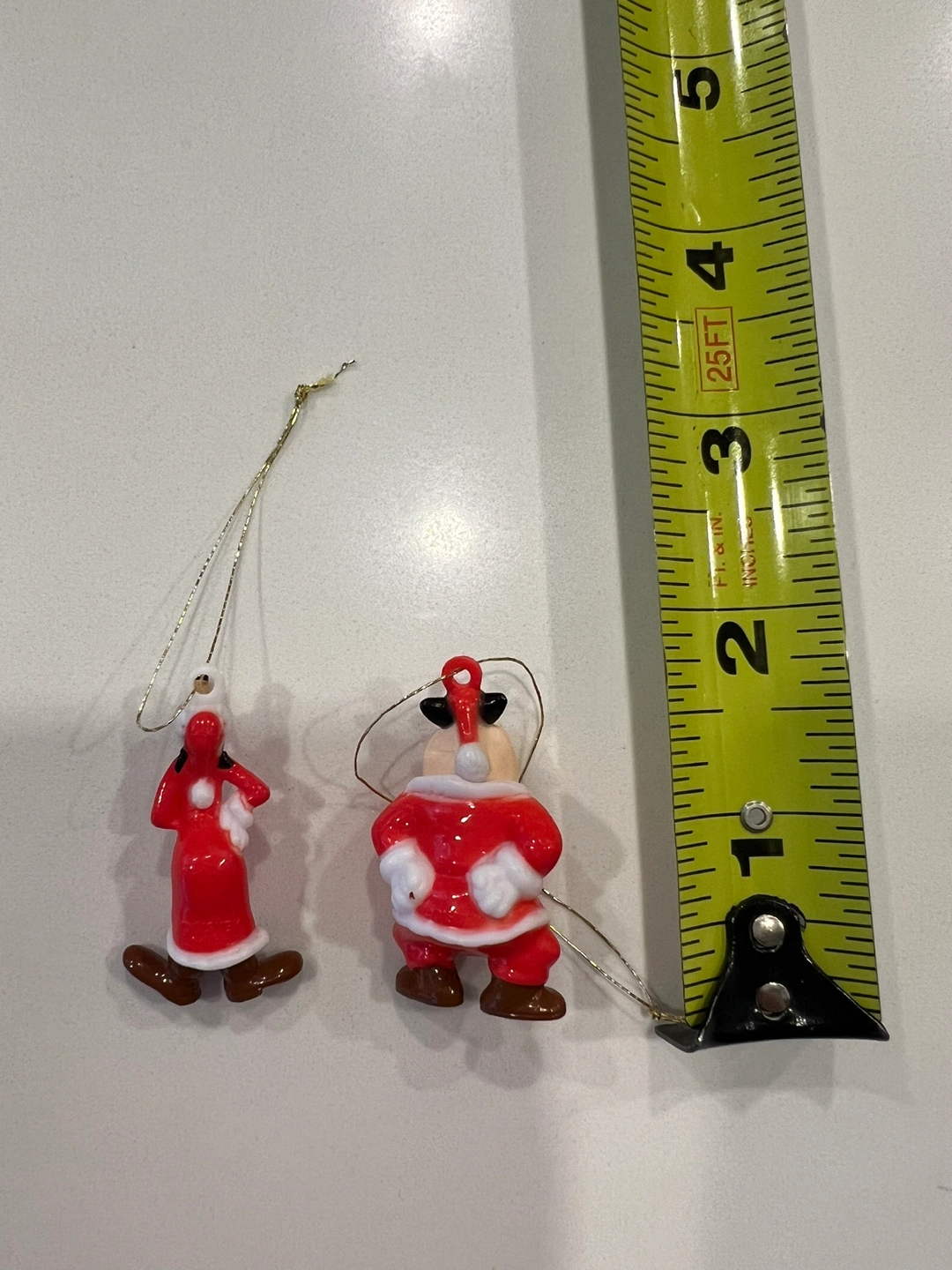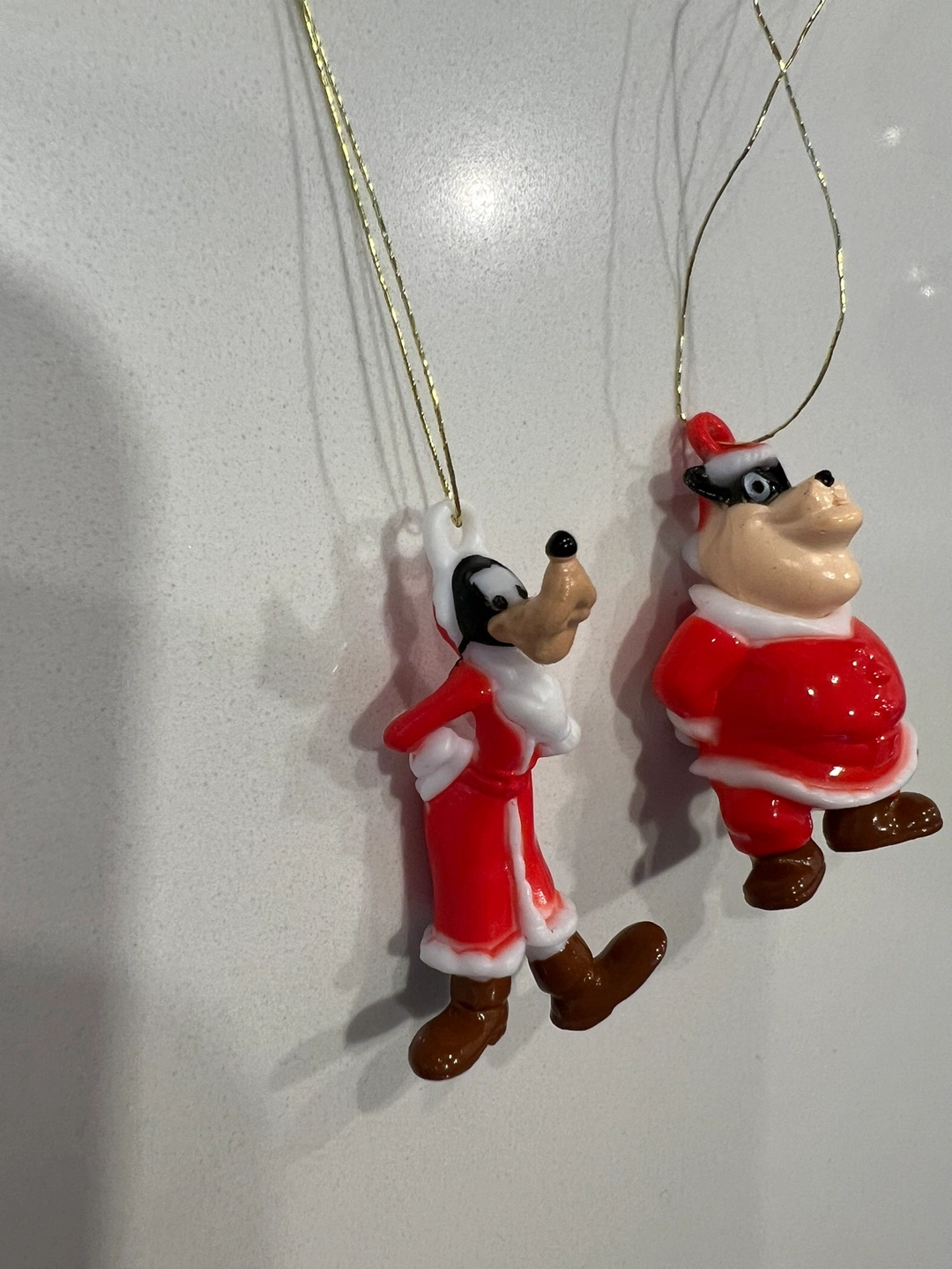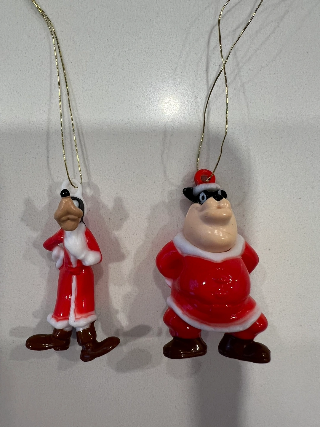 Two vintage Christmas ornaments featuring Goofy and Pete dressed as Santa Claus. Both are in a standing position. The ornaments have gold strings for hanging.
