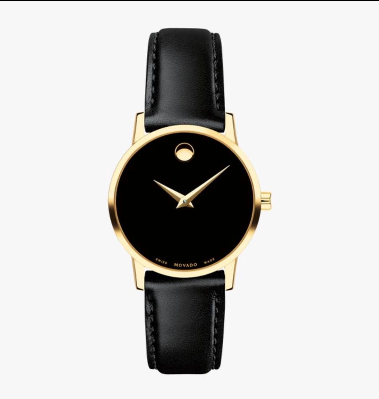 Movado Museum Classic Women’s Watch Women's Museum Classic watch, 28 mm yellow gold PVD-finished stainless steel case, black Museum dial with yellow gold-toned dot and hands, smooth black calfskin strap with yellow gold PVD-finished stainless steel buckle.