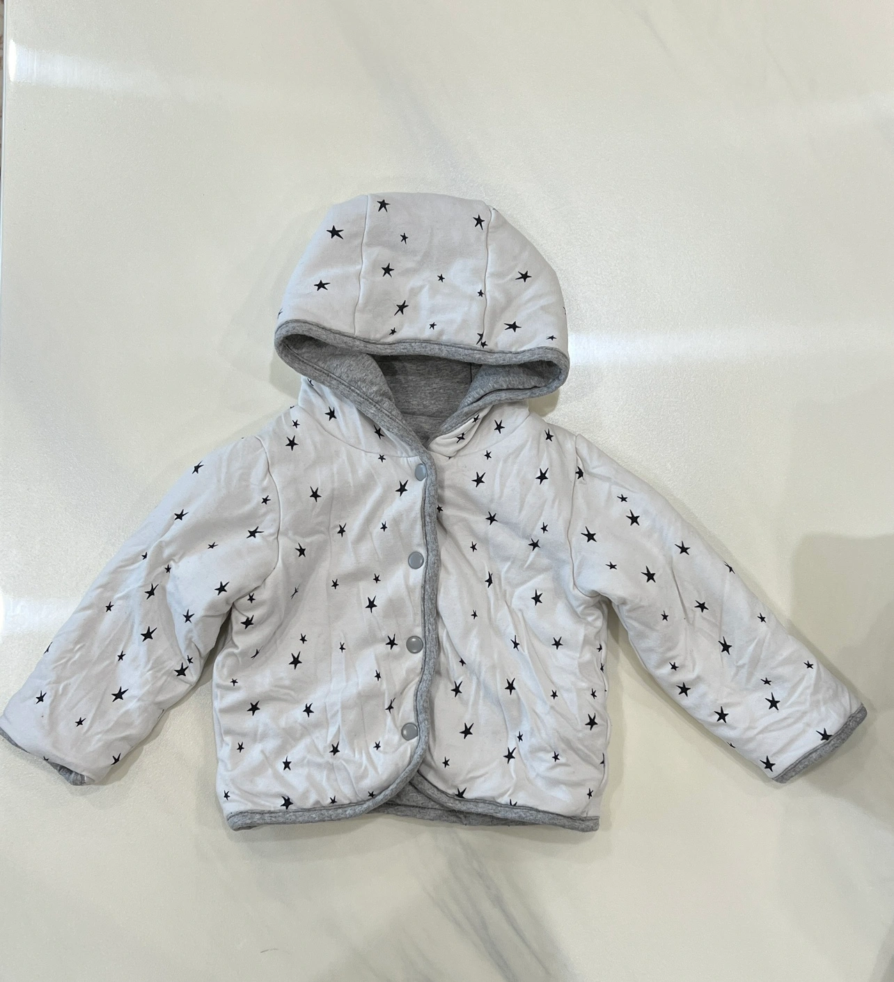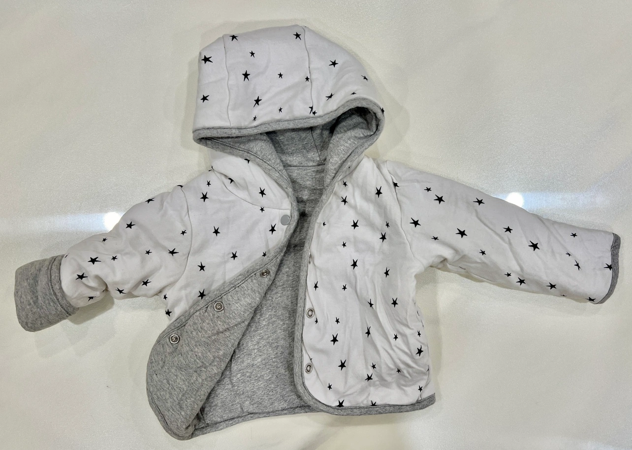 Reversible jacket with grey on one side and white with black stars on the other. It has a hood and is made of a soft, cozy material.